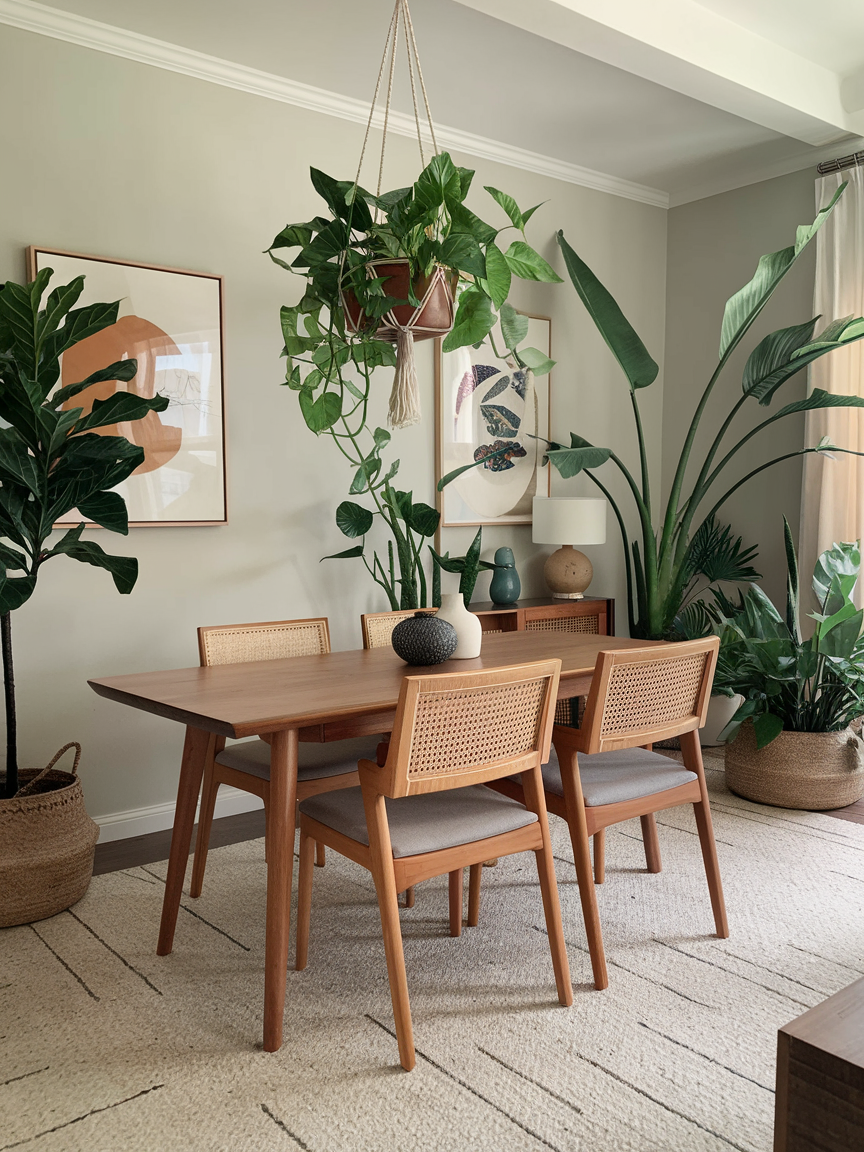 Adding greenery instantly brings life and energy to a modern boho dining room. Large floor plants, hanging planters, or small potted herbs create a natural and refreshing atmosphere. Choose simple ceramic, terracotta, or woven planters to maintain consistency with the earthy aesthetic. Plants soften architectural lines and introduce organic shapes that complement wood and woven textures. Limiting the number of plants prevents the space from feeling crowded while still achieving a lush effect. The presence of greenery enhances the relaxed mood and reinforces the connection to nature that defines boho interiors.