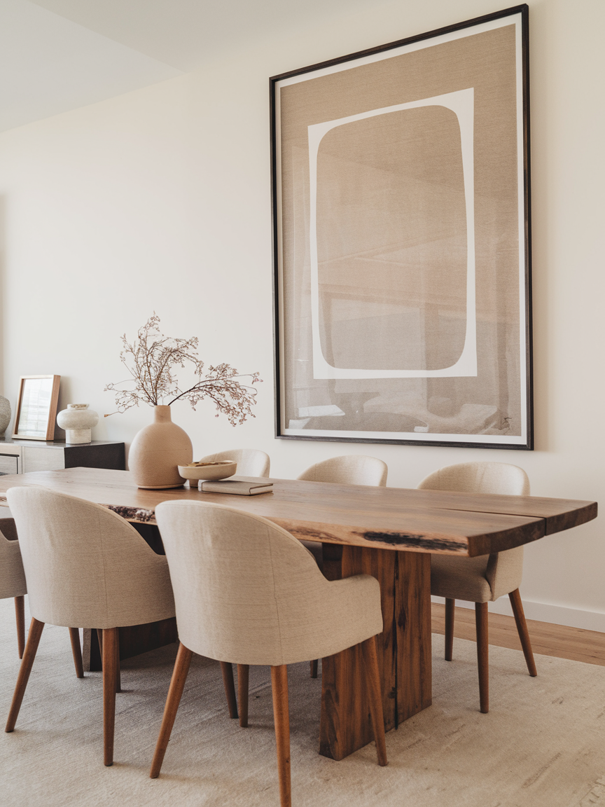 Artwork plays an important role in adding personality to a modern boho dining room, but keeping it within a neutral and earthy palette ensures the space remains calm and cohesive. Large-scale abstract pieces, soft landscape prints, or minimalist line art in tones like sand, clay, charcoal, or muted green work beautifully. Choosing one or two statement pieces rather than a crowded gallery wall helps maintain visual clarity and balance. Natural wood or slim black frames reinforce the blend of organic warmth and modern structure. Proper placement, such as centering artwork above a sideboard or along a focal wall, creates harmony within the layout. This restrained approach allows the artwork to enhance the room’s atmosphere without overwhelming it, contributing to a serene, thoughtfully curated environment.