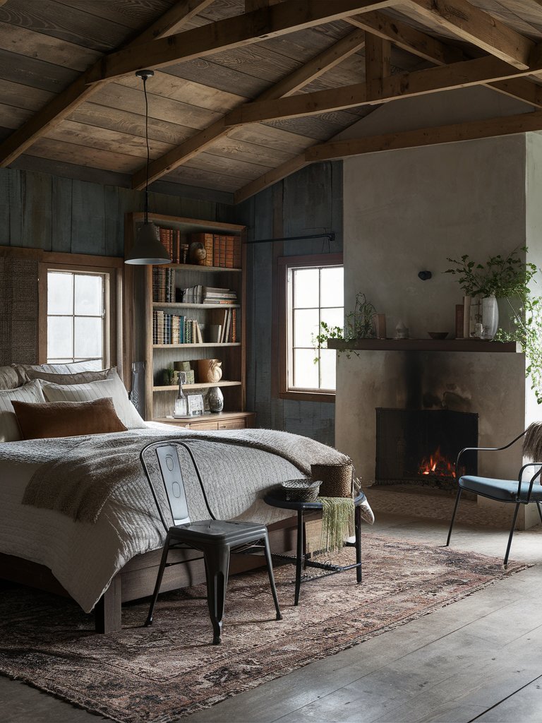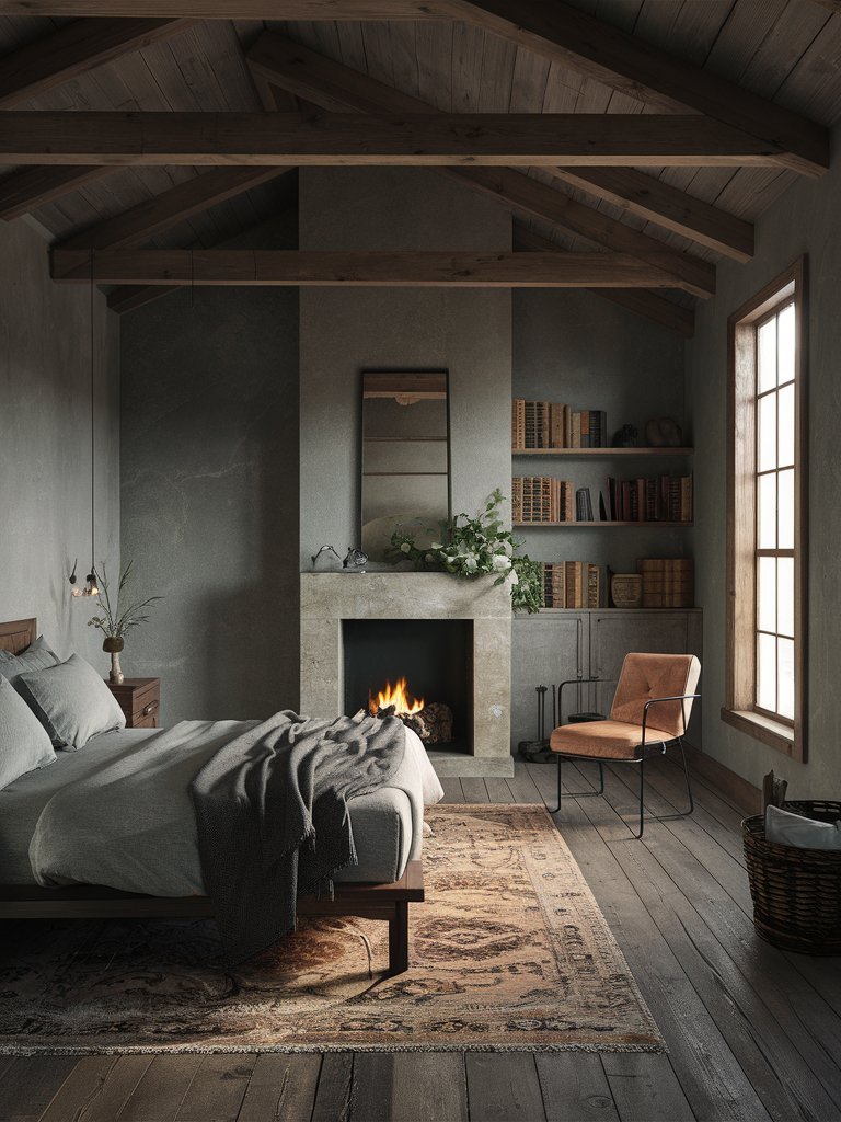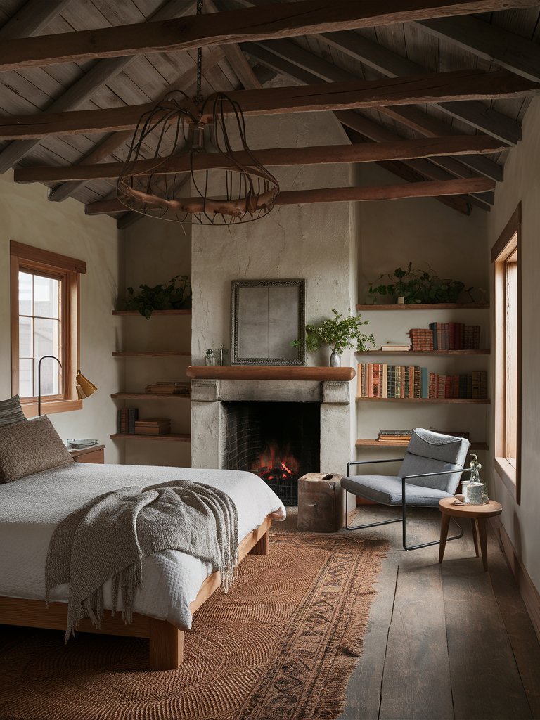 A fireplace is often considered the heart of any rustic space, and this bedroom is no exception. The elegant, minimalistic fireplace is a functional feature that adds both warmth and aesthetic appeal. The simple plaster finish of the fireplace contrasts with the textured wood elements in the room, making it stand out while maintaining a soft, natural feel. A collection of potted plants and candles on the mantel enhances the cozy atmosphere, giving it a slightly lived-in look. The glow of fire instantly makes the room more inviting, especially during colder seasons when it becomes the perfect spot to curl up with a book.