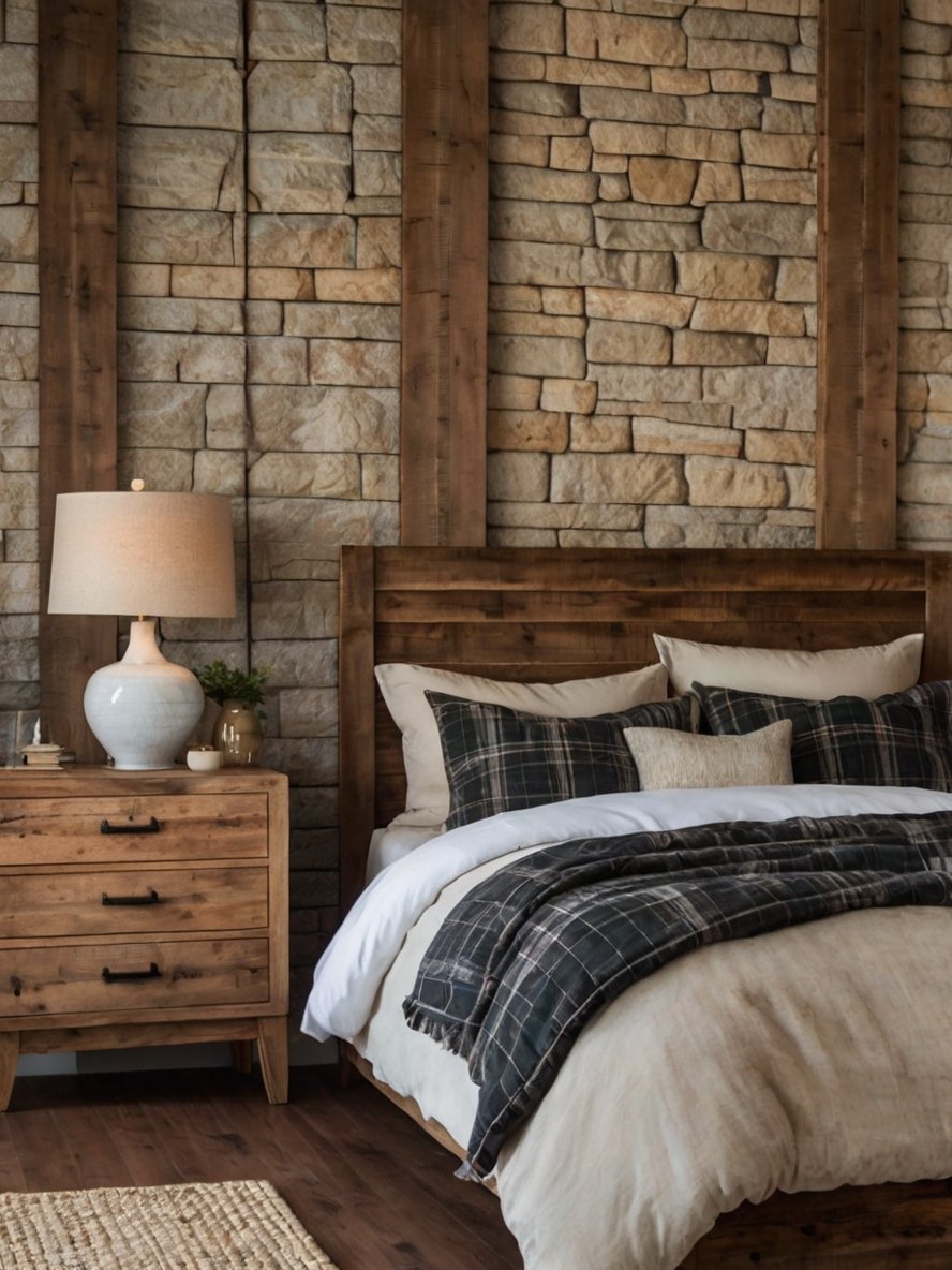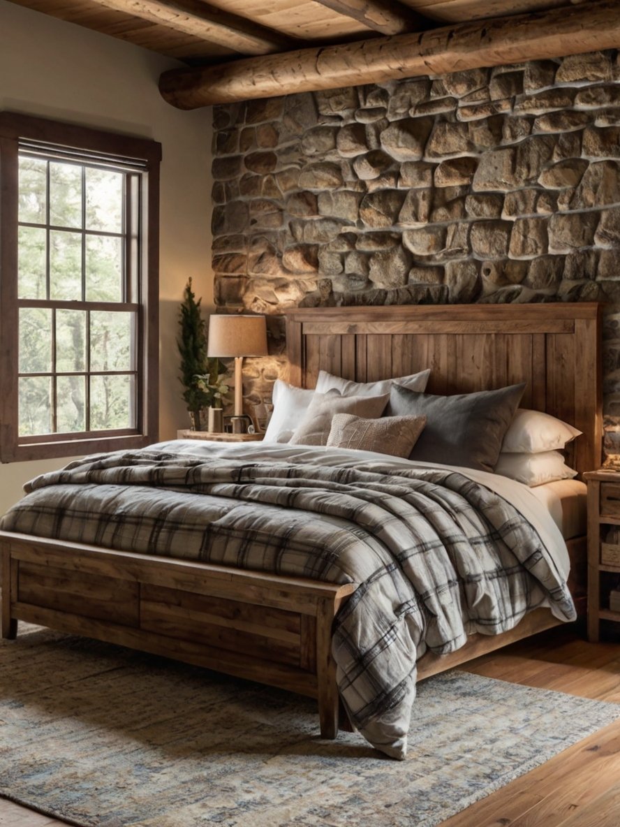 The stone accent wall is the focal point of the room, adding depth, texture, and a natural appeal. The light gray and beige stone pieces are carefully stacked, creating a visually intriguing and tactile backdrop for the bed. To enhance the rustic warmth, wooden beams frame the stone wall, introducing a beautiful contrast between the raw, earthy stone and the rich wood tones. This combination ensures the room feels cozy rather than cold, which can sometimes happen with stone-heavy interiors. This architectural feature evokes the ambiance of a luxury cabin, bringing a sense of strength and authenticity to the bedroom.
