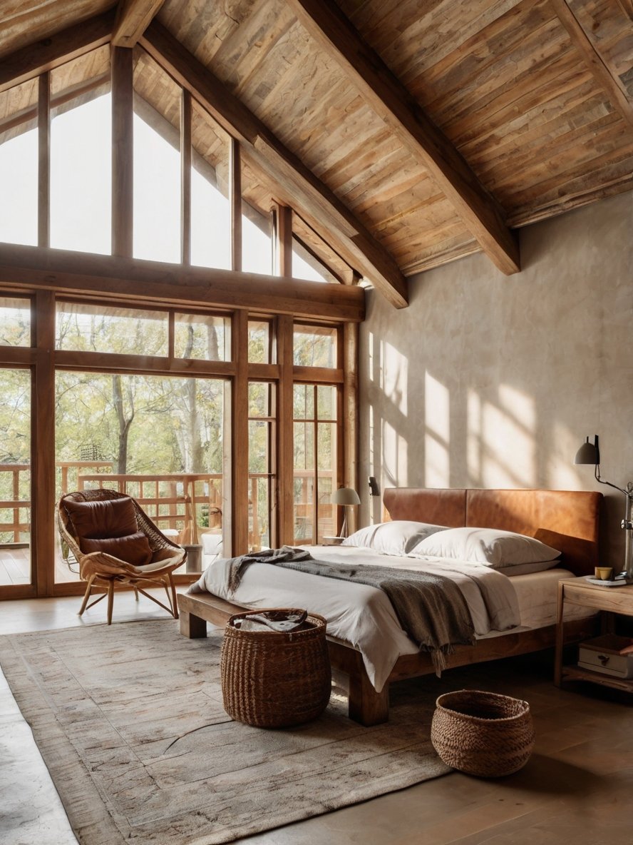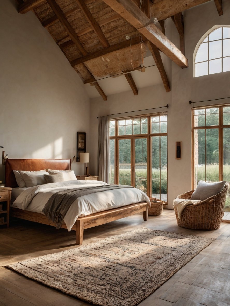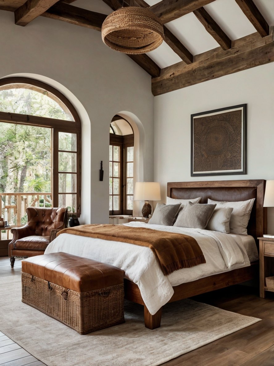 The bedroom incorporates leather elements, such as the tufted bench at the foot of the bed and the rich brown leather armchair, to add a sense of durability and refined masculinity. These leather pieces contrast beautifully with the softer textiles, creating an interesting mix of textures. The woven basket chest at the foot of the bed is both practical and stylish, reinforcing the rustic aesthetic while providing functional storage. The natural imperfections in the leather add to the authenticity of the space, making it feel both luxurious and approachable.