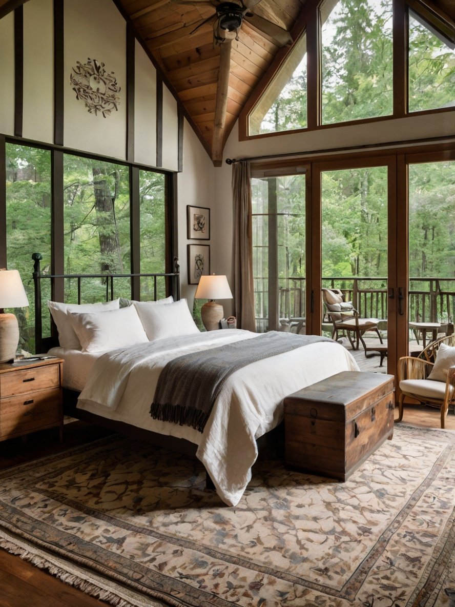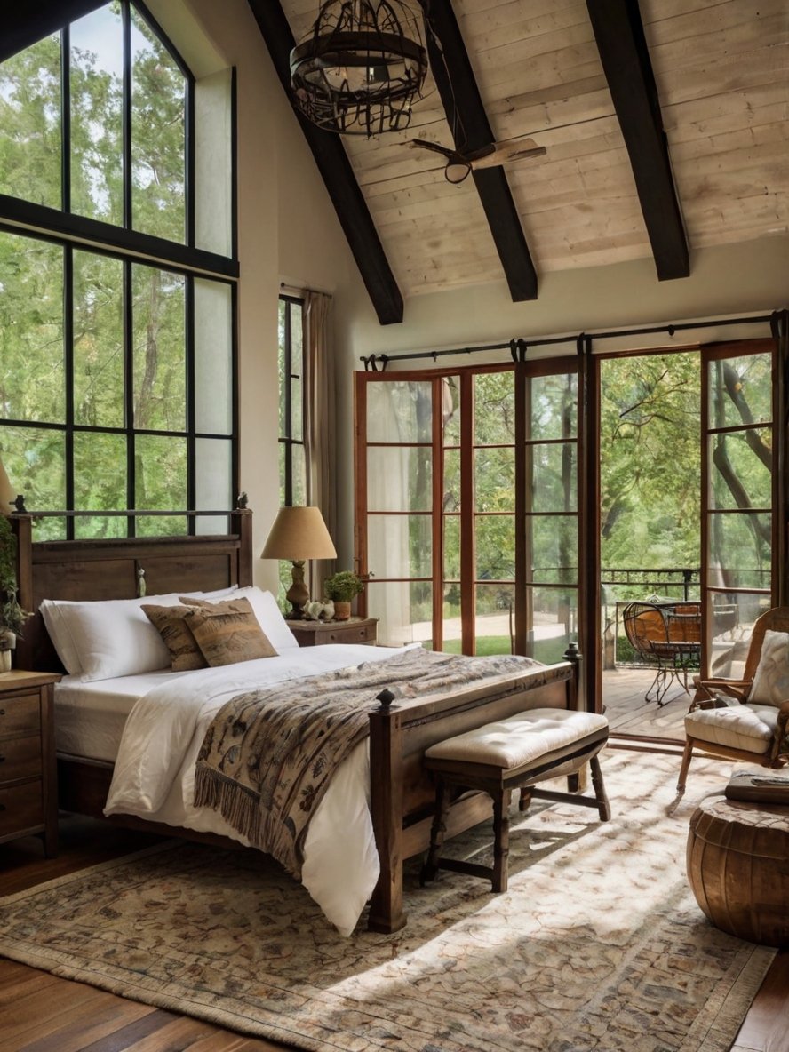 One of the most striking features of this rustic bedroom is the floor-to-ceiling windows that bathe the space in natural light. The wooden frames add warmth while maintaining a cohesive rustic aesthetic. These windows not only allow sunlight to stream in but also provide breathtaking views of the lush greenery outside, creating a strong connection between the bedroom and nature. The presence of an arched window above further enhances the openness of the space. This design choice makes the bedroom feel more spacious and inviting, perfect for those who appreciate the tranquility of natural surroundings.