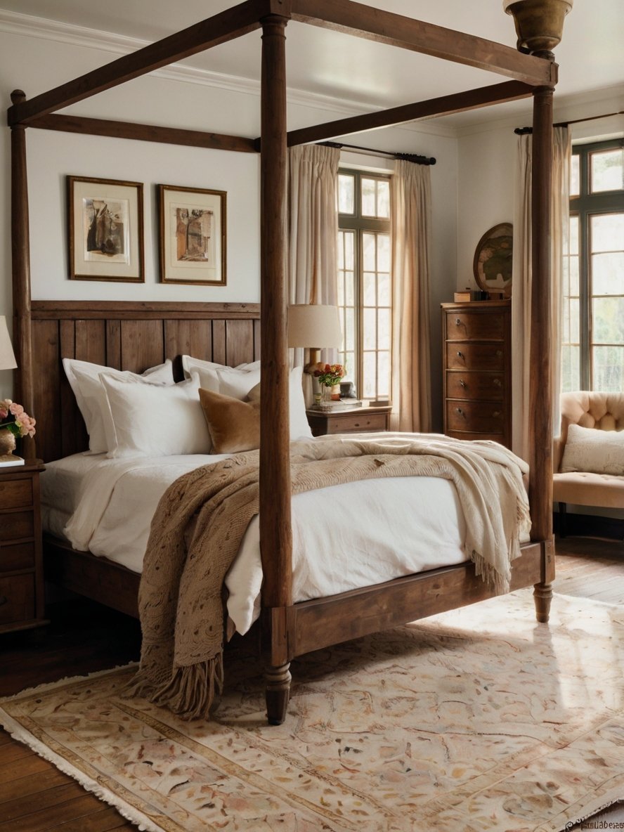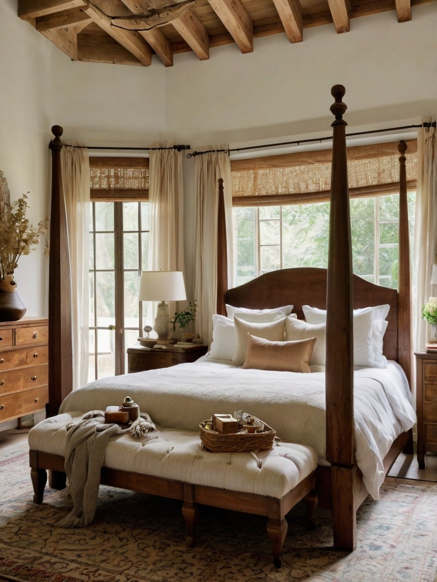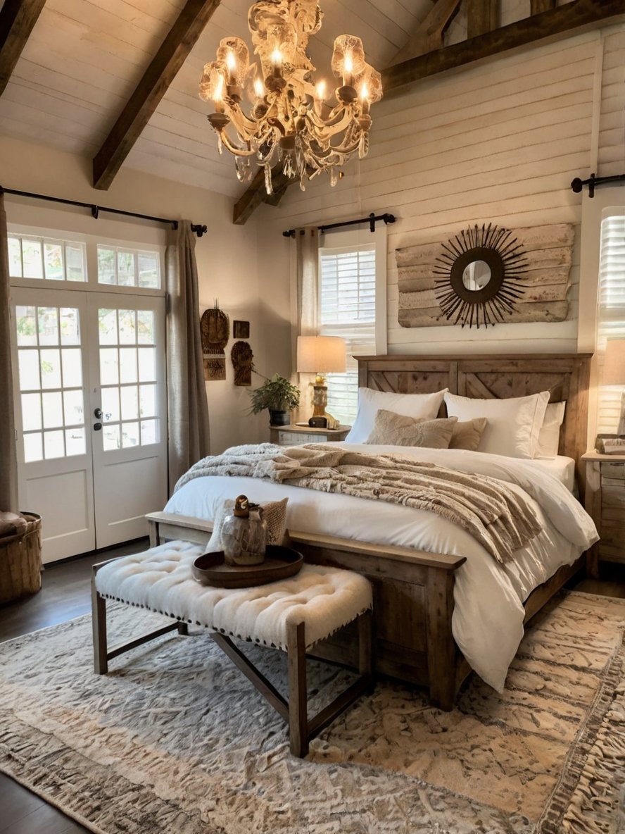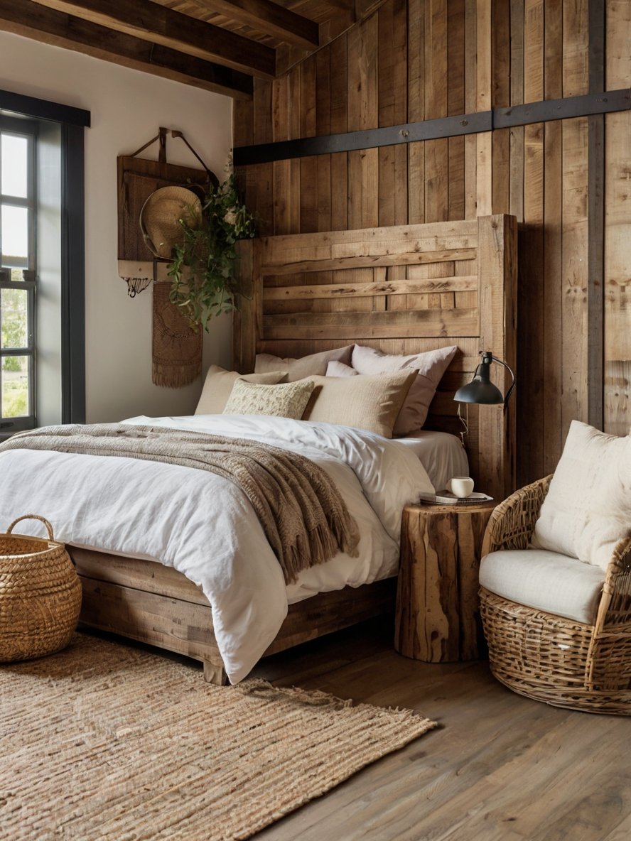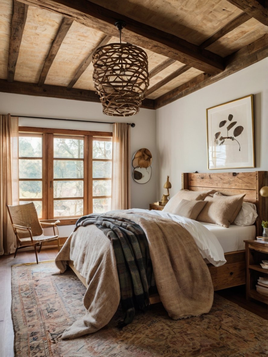 Every design choice in this bedroom works together to create an atmosphere of warmth, elegance, and rustic charm. The earthy color palette, layered textures, natural wood elements, and curated furnishings make the space feel both luxurious and approachable.