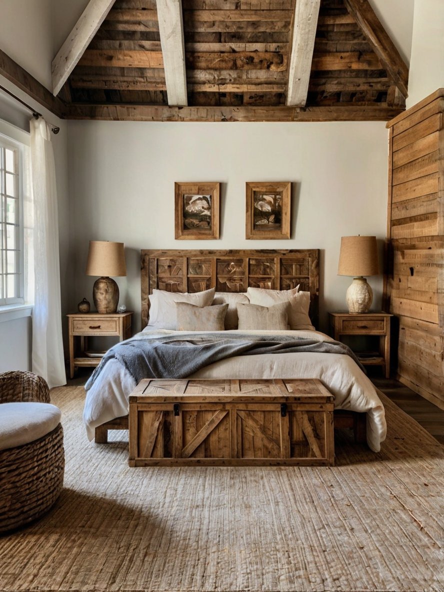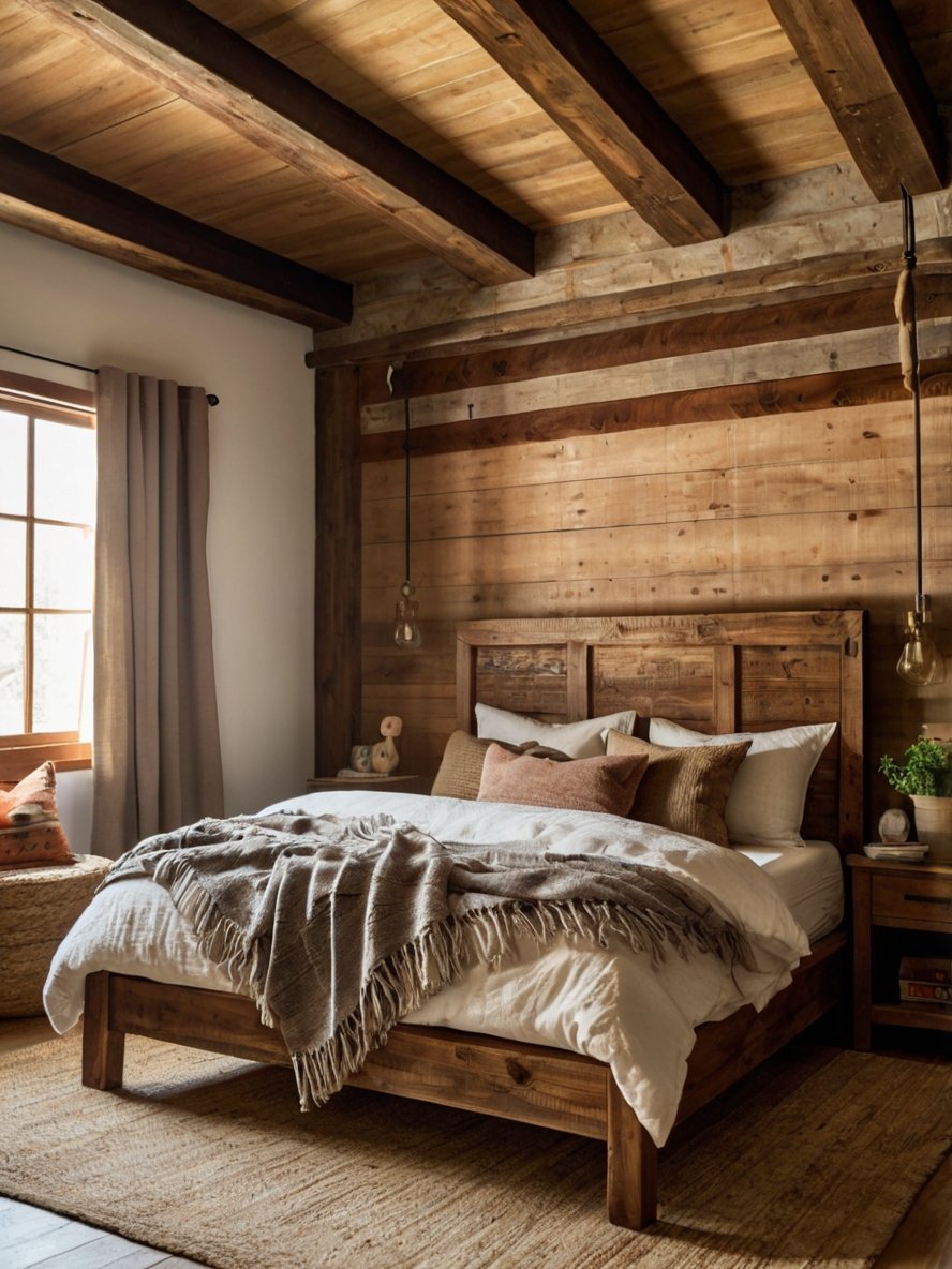 The dominant feature of this bedroom is its extensive use of wood, from the exposed ceiling beams to the bed frame and nightstands. The wood’s natural grain and slightly distressed finish add depth and authenticity to the space. The combination of horizontal wooden planks on the wall and vertical beams creates an architectural balance, reinforcing the rustic aesthetic. This approach embraces the beauty of imperfections, allowing knots, cracks, and grain patterns to shine through, which enhances the room’s warm, lived-in feel. The wood’s earthy hues complement the soft furnishings, creating a seamless blend of textures.