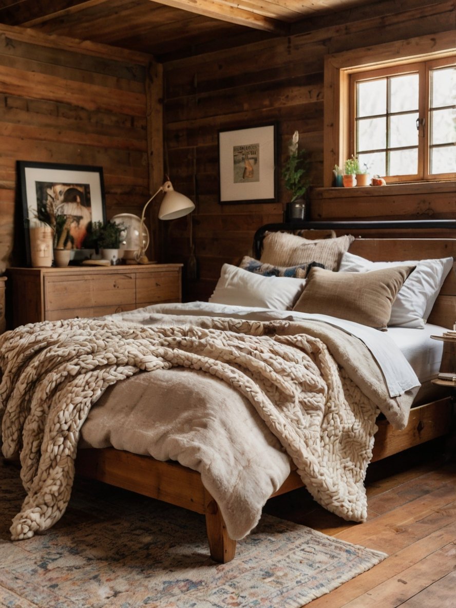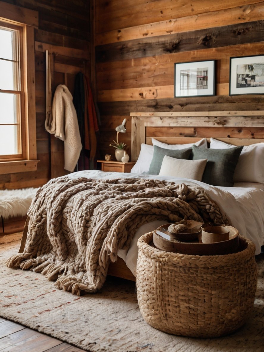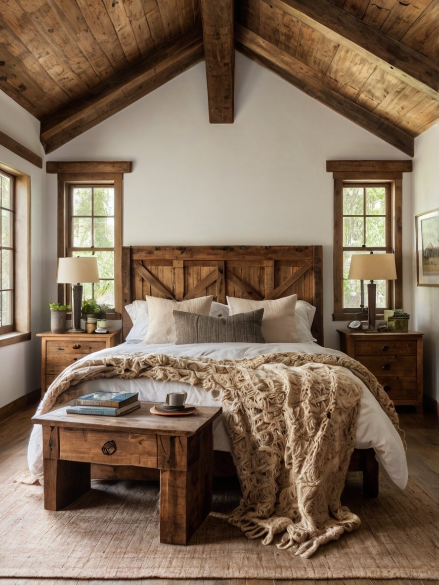 The bed is the focal point of this rustic bedroom, with its sturdy wooden frame and cross-patterned headboard adding a charming farmhouse appeal. The natural wood grain and slightly distressed finish give it an authentic, handcrafted look. The bedding is kept soft and neutral, with crisp white linens providing a fresh contrast against the rich wooden tones. A mix of textured pillows in neutral shades enhances the cozy and layered look, making the bed feel inviting and plush. The chunky knit throw blanket draped over the bed adds a touch of warmth and comfort, reinforcing the rustic charm. This bed setup is the perfect combination of elegance and relaxation, making the room feel like a tranquil getaway.