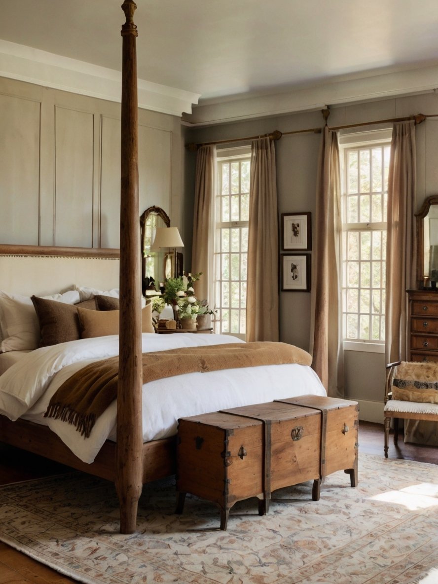 At the foot of the bed, an antique wooden storage trunk serves as both a functional and aesthetic statement piece. The aged patina, iron hardware, and rustic finish of the trunks evoke a sense of nostalgia, making them feel like cherished heirlooms. These trunks add an element of storytelling, as they appear to have been used and loved over the years.