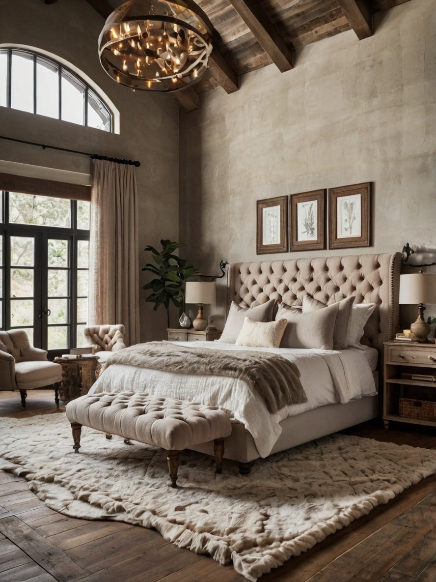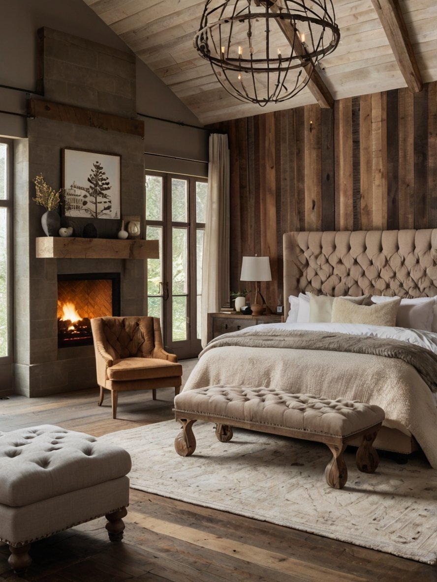 The striking tufted headboard immediately catches the eye, bringing an element of refined elegance to this rustic bedroom. Its soft beige upholstery adds warmth while the deep button tufting enhances texture and sophistication. The tall, winged design provides a grand backdrop for the bed, making it the undisputed focal point of the room. Unlike traditional rustic spaces that rely solely on raw wood, this headboard balances the rugged and refined elements beautifully. It exudes a cozy and inviting aura while maintaining a timeless and luxurious feel, perfectly blending rustic aesthetics with a touch of vintage charm.