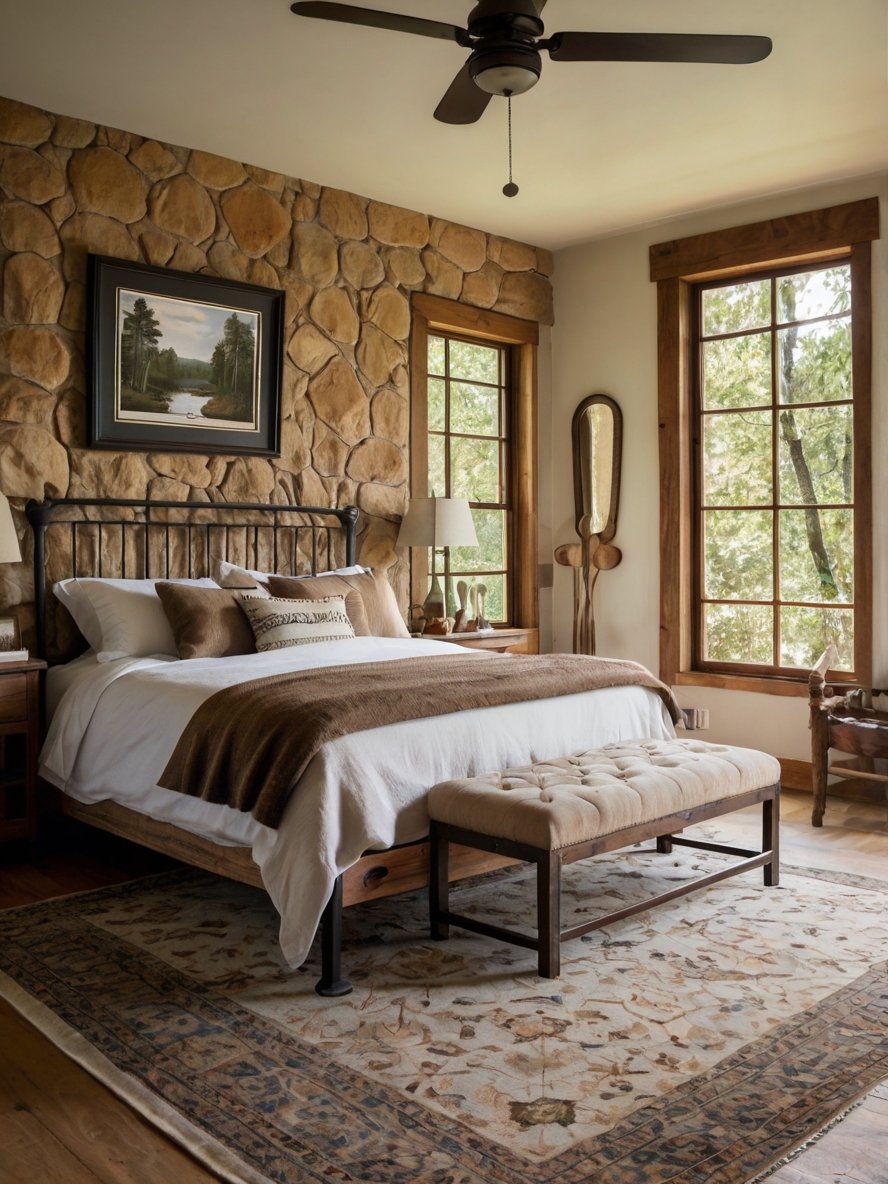 The stunning stone accent wall behind the bed is the centerpiece of this rustic bedroom. The irregularly shaped stones, in various earthy hues, create a rugged yet sophisticated backdrop, reinforcing the cabin-like aesthetic. The raw texture of the stones adds depth and dimension, making the wall an eye-catching focal point. The warm lighting softly highlights the contours of the stones, enhancing the room’s inviting atmosphere. This element not only adds character but also connects the interior to the natural surroundings, making the space feel like an extension of the outdoors.