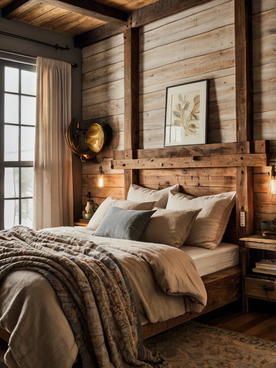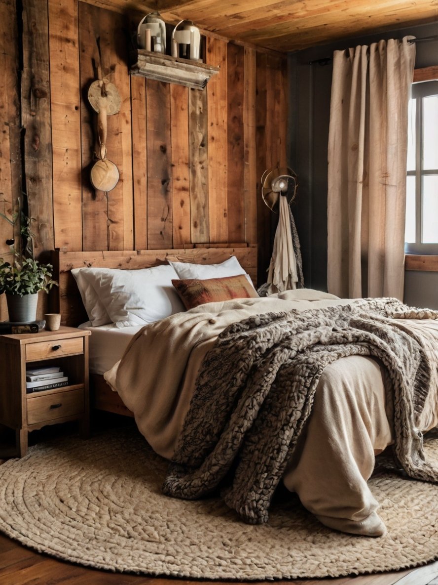 The wood-paneled wall behind the bed acts as the centrepiece of this bedroom, setting the tone for the entire space. With its rich grain, knots, and weathered textures, the wood provides an authentic, timeworn appeal that enhances the rustic aesthetic.