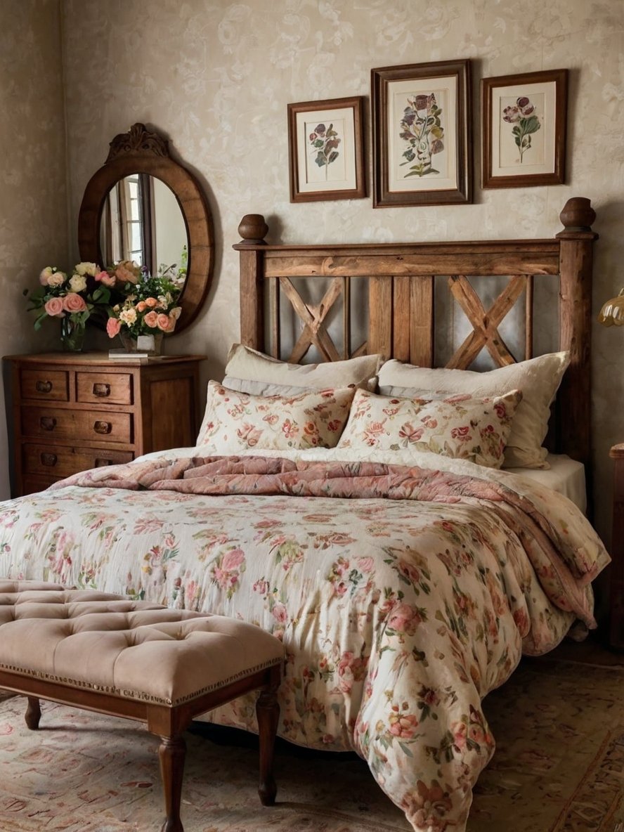 The floral-patterned bedding transforms this rustic bedroom into a romantic retreat. The delicate hues of blush pink, soft greens, and muted pastels create an inviting and cozy ambiance. The slightly wrinkled texture of the quilt adds to the casual charm, making the room feel effortlessly comfortable. The layered look, with plush pillows and a coordinating comforter, enhances the depth and visual interest of the bedding arrangement. The floral print, reminiscent of vintage country aesthetics, ties beautifully with the overall rustic theme, adding an element of timeless charm.