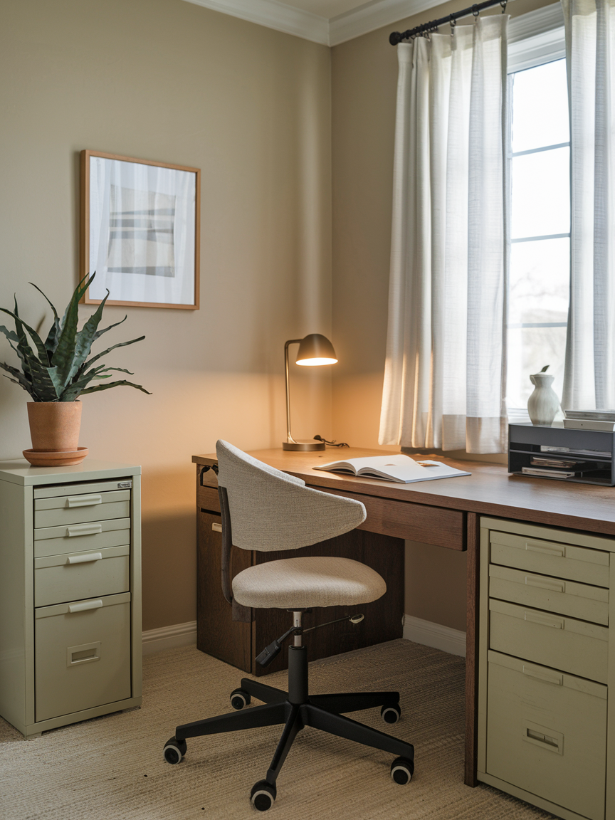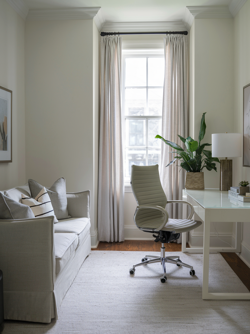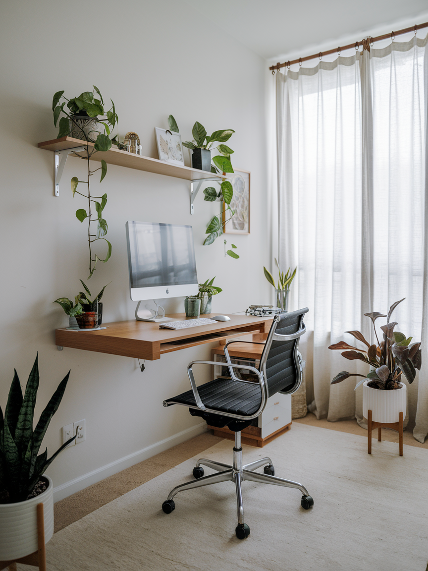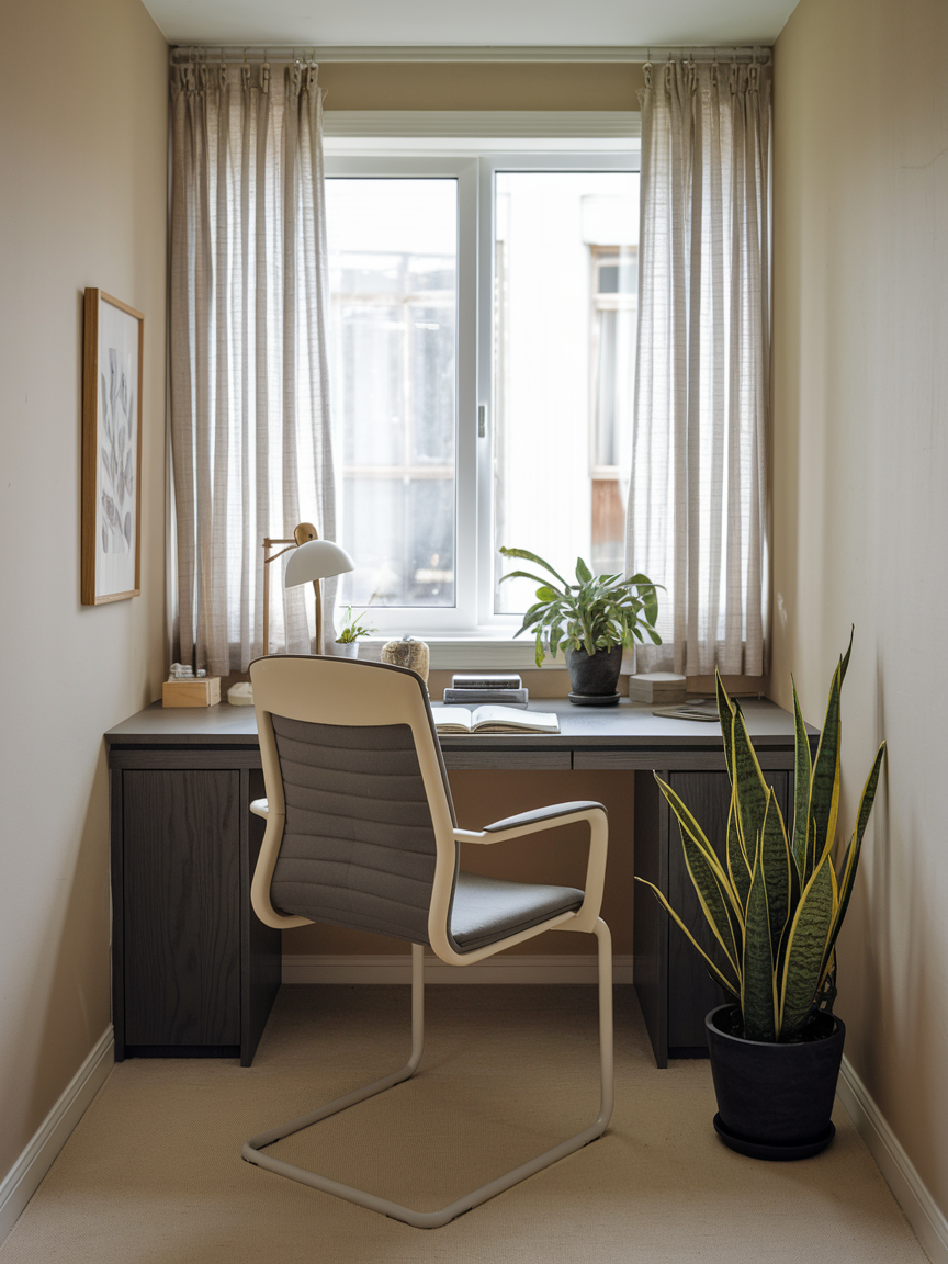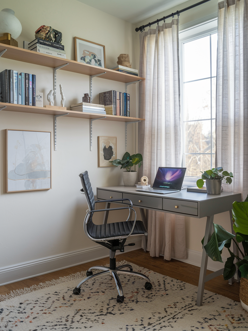 Colors can totally change how a room feels, and in a small home office, light shades are your best friend. White, soft grays, or pale pastels make the space feel airy and open. The trick here is that lighter walls reflect more light, giving the illusion of extra space even if you are working in what feels like a closet. Pair that with minimal furniture and you get a clean, fresh vibe that makes focusing a lot easier. Bonus points if you sneak in a little greenery for a pop of life and balance.