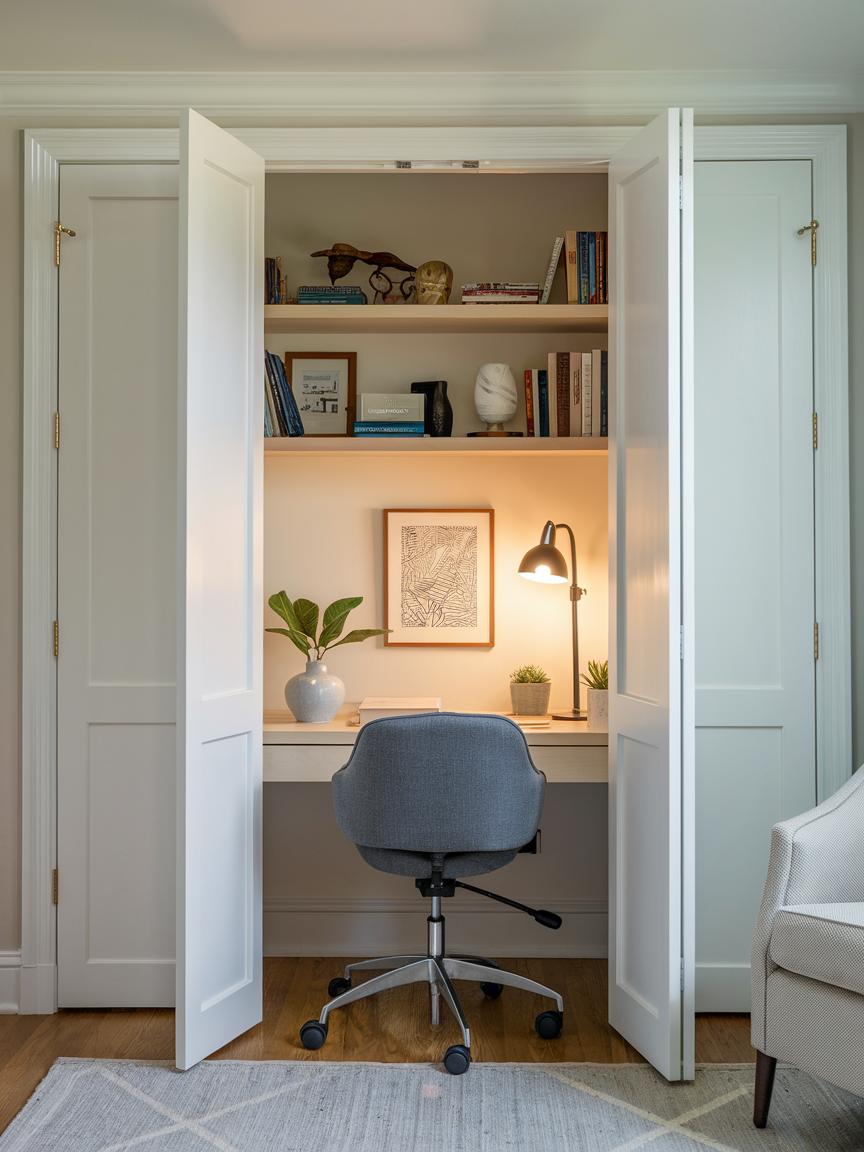 You might not think of a closet as an office, but trust me, it works. A cloffice is basically a closet transformed into a small but mighty workstation. All you need is a slim desk or floating shelf, a comfy chair, and some good lighting. Add shelves above for storage, and you are good to go. The best part? When you are done, you can literally shut the doors and forget about work until tomorrow. It keeps your workspace separate without taking over your living area. Plus, there is something oddly satisfying about having a hidden office.