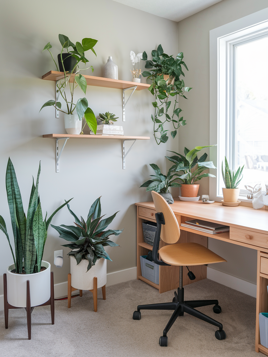 Plants have a way of instantly making a space feel alive and calming. Even in a small office, a touch of greenery can improve the vibe dramatically. Go for low-maintenance plants like snake plants, pothos, or succulents if you do not have a green thumb. Place them on your desk, shelves, or even hanging from the wall if floor space is tight. Beyond aesthetics, plants can also improve air quality and reduce stress. Think of them as your silent little coworkers who never talk too much during Zoom calls.