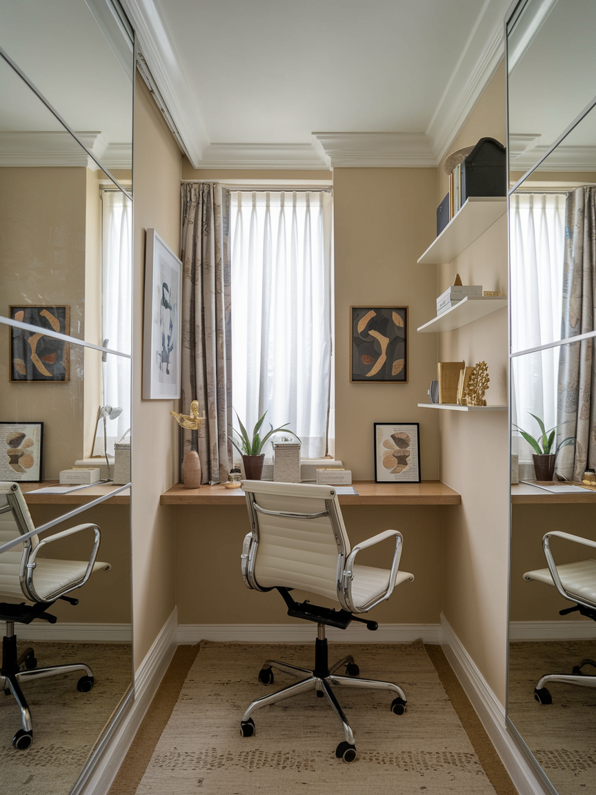 Mirrors are one of the oldest tricks in the design book for making small spaces feel larger, and they work wonders in home offices. A well-placed mirror bounces light around the room, making it brighter and more spacious. You can go for a sleek wall mirror, a standing mirror if you have the floor space, or even a few small ones arranged decoratively. Besides, it is a quick way to check if you look presentable before hopping onto a video call. It is like doubling your space without lifting a hammer.