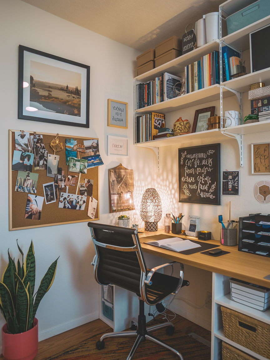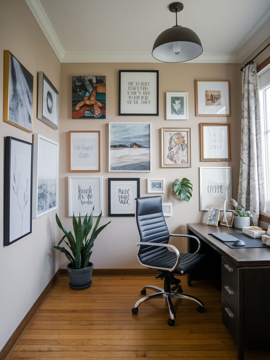 Who says your office walls have to be boring? A gallery wall filled with your favorite art, quotes, or even photos can make the space feel inspiring and personal. In a small office, the walls are often underused, so why not turn them into a focal point? This adds personality without cluttering your desk or shelves. The key is to curate it thoughtfully so it feels cohesive rather than chaotic. Every time you glance up, you get a little boost of creativity or motivation, which is a win for your workflow.