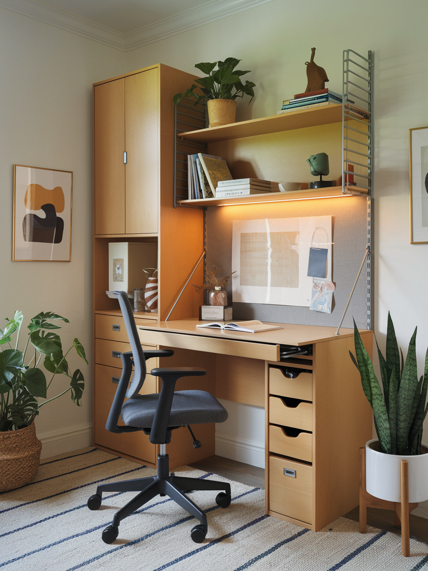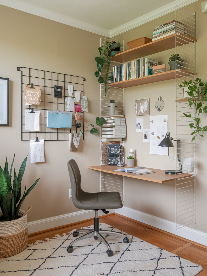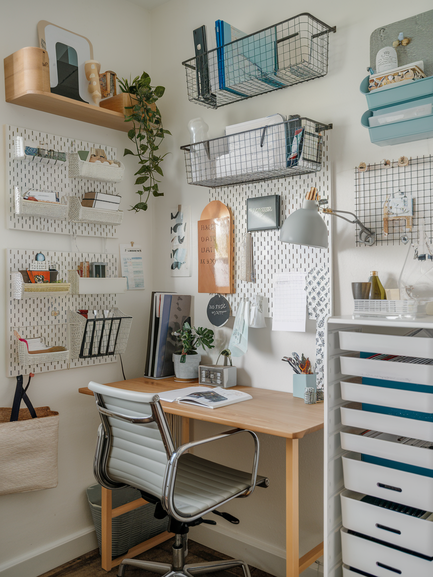 Clutter is the enemy of small spaces, so keeping things organized is key. Wall-mounted organizers like pegboards, wire baskets, or magnetic boards save you desk space while keeping essentials close at hand. You can customize them to hold supplies, notes, or even decorative items. The beauty of this approach is that it keeps your desk clear without sacrificing storage. Plus, it looks super intentional and creative, which is always nice when you are trying to make a small area feel styled rather than improvised.