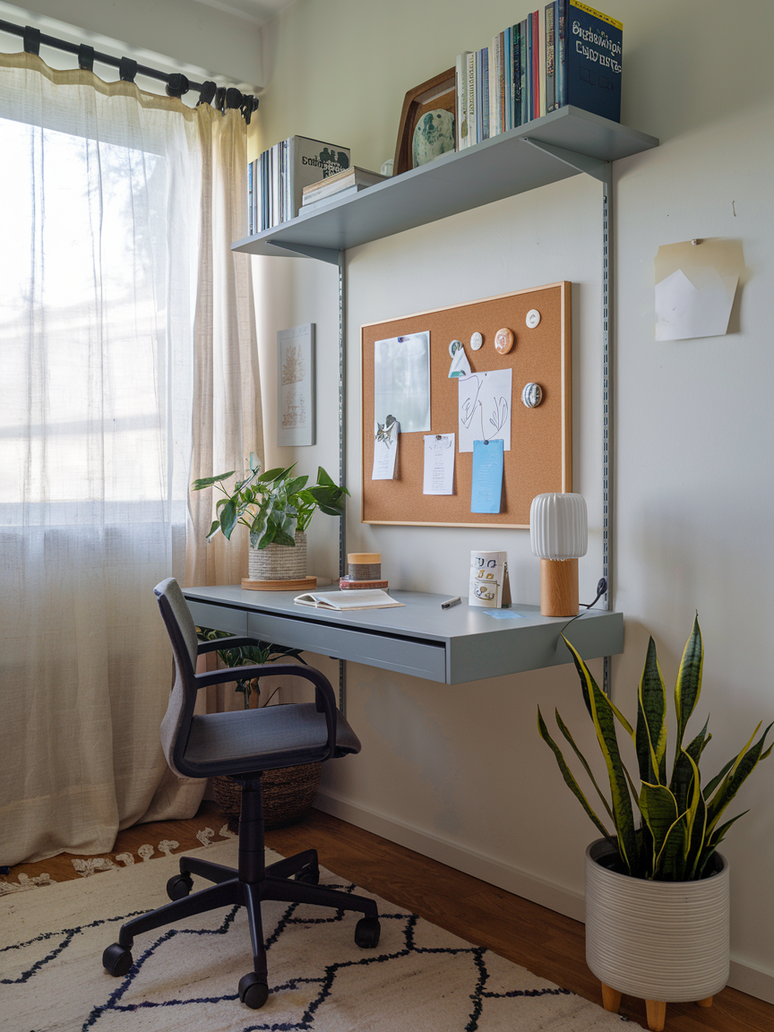 A floating desk is like magic for small spaces. It attaches right to the wall, giving you a sturdy work surface without eating up precious floor space. You can tuck a chair under it when you are done, and suddenly the room feels bigger again. The beauty of this option is how sleek and minimal it looks, plus you can customize it to fit even the smallest corner. Pair it with a few wall shelves above, and you have a mini workstation that feels intentional. The best part? No one will ever know you squeezed an office into that tiny nook.
