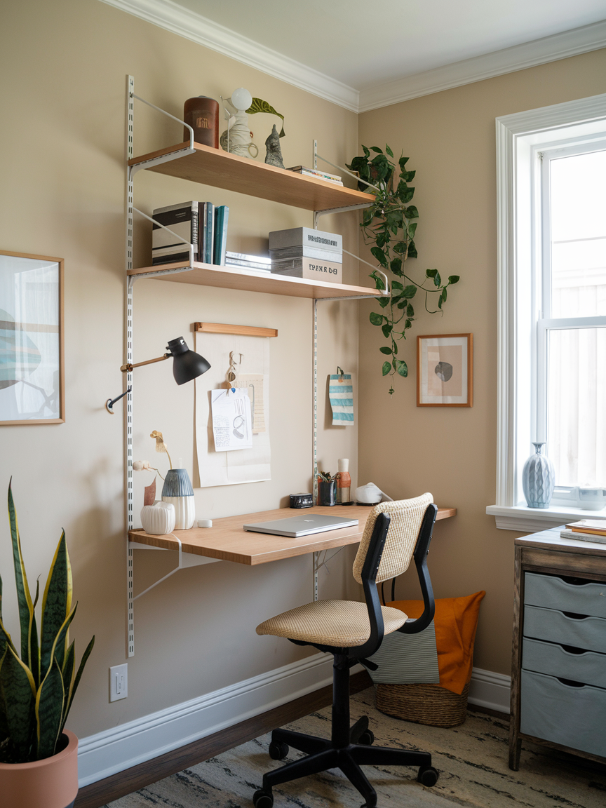 If you do not have room for a traditional desk, a sturdy wall shelf can easily double as one. Mount it at desk height, and voila, you have a functional workspace that barely takes up any room. Pair it with a small chair or stool and maybe a floating shelf above for storage. This option is great for ultra-tight spaces where even compact desks feel too big. It is also budget-friendly and customizable since you can choose any shelf that matches your style. Think of it as the minimalist desk upgrade you did not know you needed.