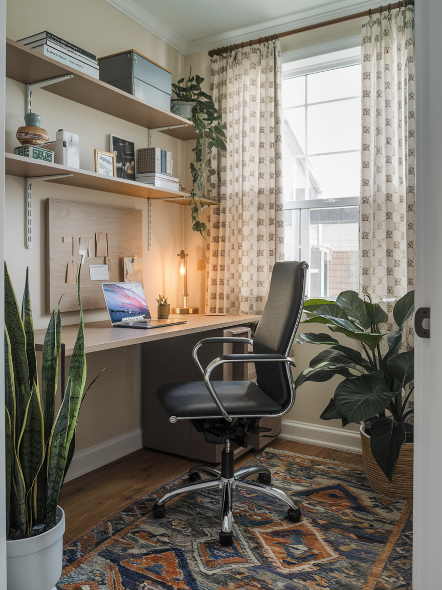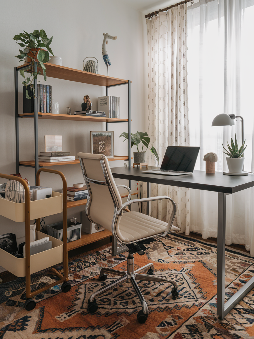 If your office is part of another room, like your bedroom or living room, rugs are the perfect way to separate it visually. A small area rug under your desk creates a defined workspace without walls. Plus, it adds a cozy vibe and helps reduce noise from your chair rolling around. Choose a pattern or color that complements your decor but still makes the office feel distinct. It is amazing how something as simple as a rug can create a sense of “this is my work zone” even in the tiniest setup.