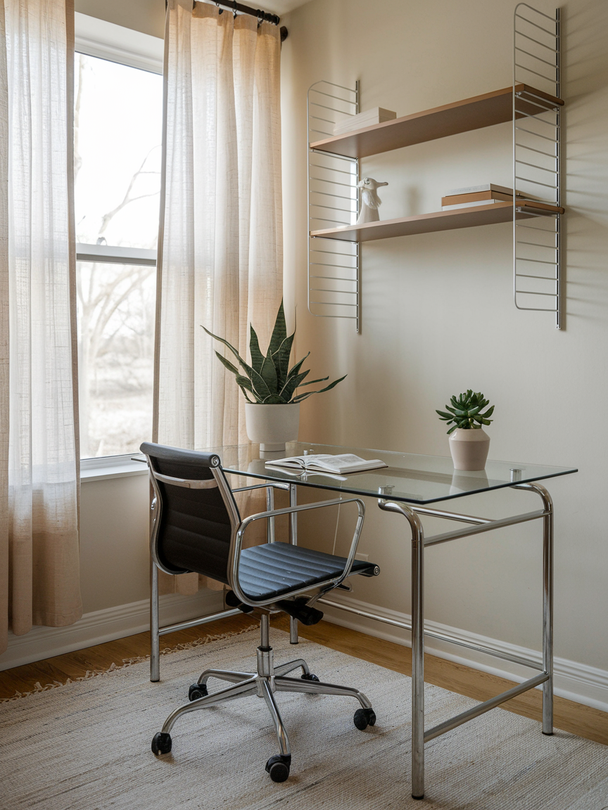 Small home offices benefit from furniture that feels light and doesn’t visually crowd the room. Glass or acrylic desks and chairs are perfect for this. They almost disappear into the space, making it look more open and less cluttered. Add a few metallic accents like a gold lamp or silver drawer pulls and suddenly the whole setup feels chic and modern. The trick is to balance transparency with cozy details so it still feels inviting. This is one of those clever design hacks that feels almost too good to be true.