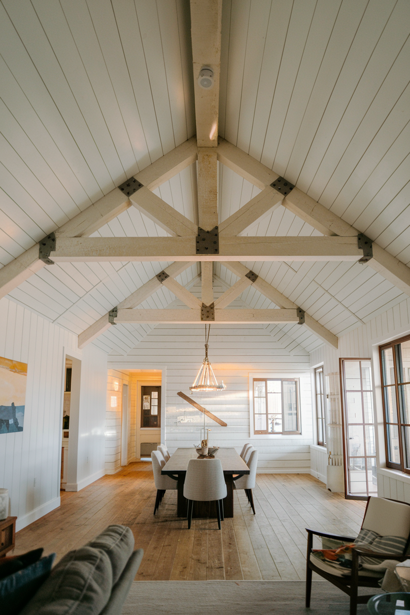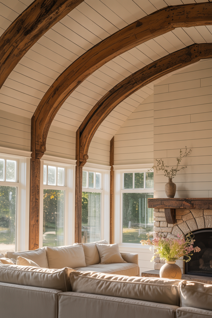 Curved beams are a striking way to soften the angles of a room and create a visually dynamic ceiling. When installed over white shiplap, the gentle arcs of the beams stand out beautifully, bringing motion and grace to the space. This look is perfect for vaulted great rooms or romantic bedrooms where you want something a little more sculptural than the typical straight-line design. The curves also work well with other rounded elements like arched windows or circular chandeliers.