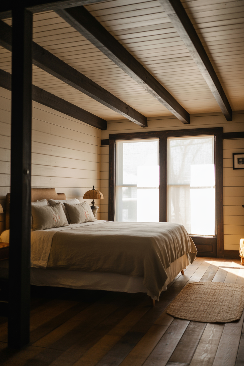 In the bedroom, contrast can add intimacy and drama. Use a lighter shiplap for the ceiling to keep the room feeling open and airy, and then introduce darker-stained beams to define the space and add cozy depth. This approach frames the ceiling like artwork and helps create a snug, cocoon-like vibe. It pairs especially well with soft, layered bedding, woven rugs, and vintage-inspired lighting for the ultimate rustic retreat.