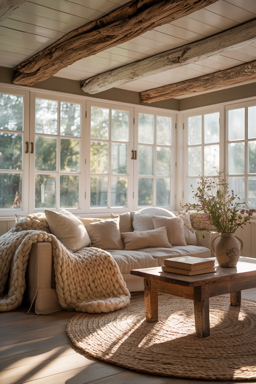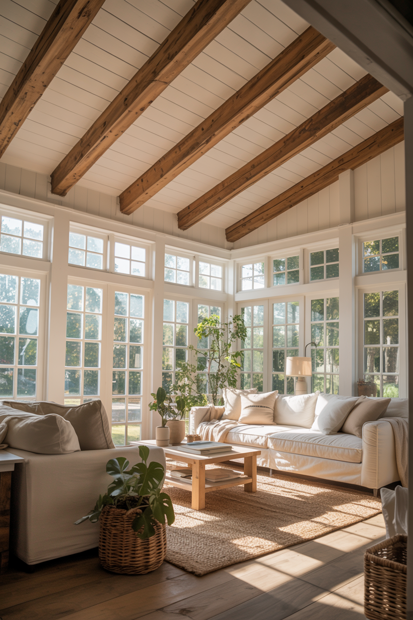 A shiplap ceiling with exposed beams is an excellent way to add rustic character to a sunroom, especially one with floor-to-ceiling windows. The white shiplap enhances the natural light pouring in, while the beams lend visual structure and balance. Consider lighter wood tones to keep things casual and bright, or try a bleached finish for a more refined look. This ceiling style makes the sunroom feel like a cozy escape that connects effortlessly to the outdoors.