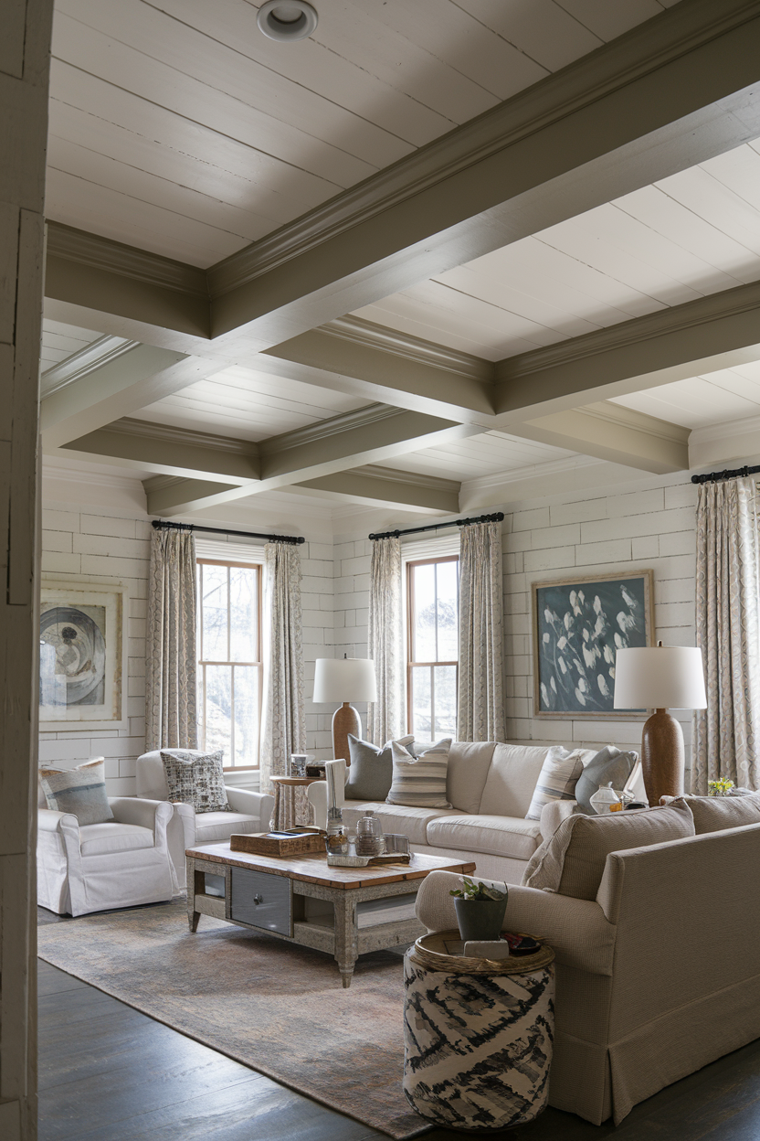 If your home blends modern and traditional elements, painted beams over white shiplap can help bridge the gap. Choose a muted taupe, sage green, or charcoal paint color for your beams to complement transitional furnishings and soft textiles. This look brings balance, clean and tailored, yet warm and character-rich. It’s especially effective in hallways, powder rooms, or family spaces where subtle elegance is key.