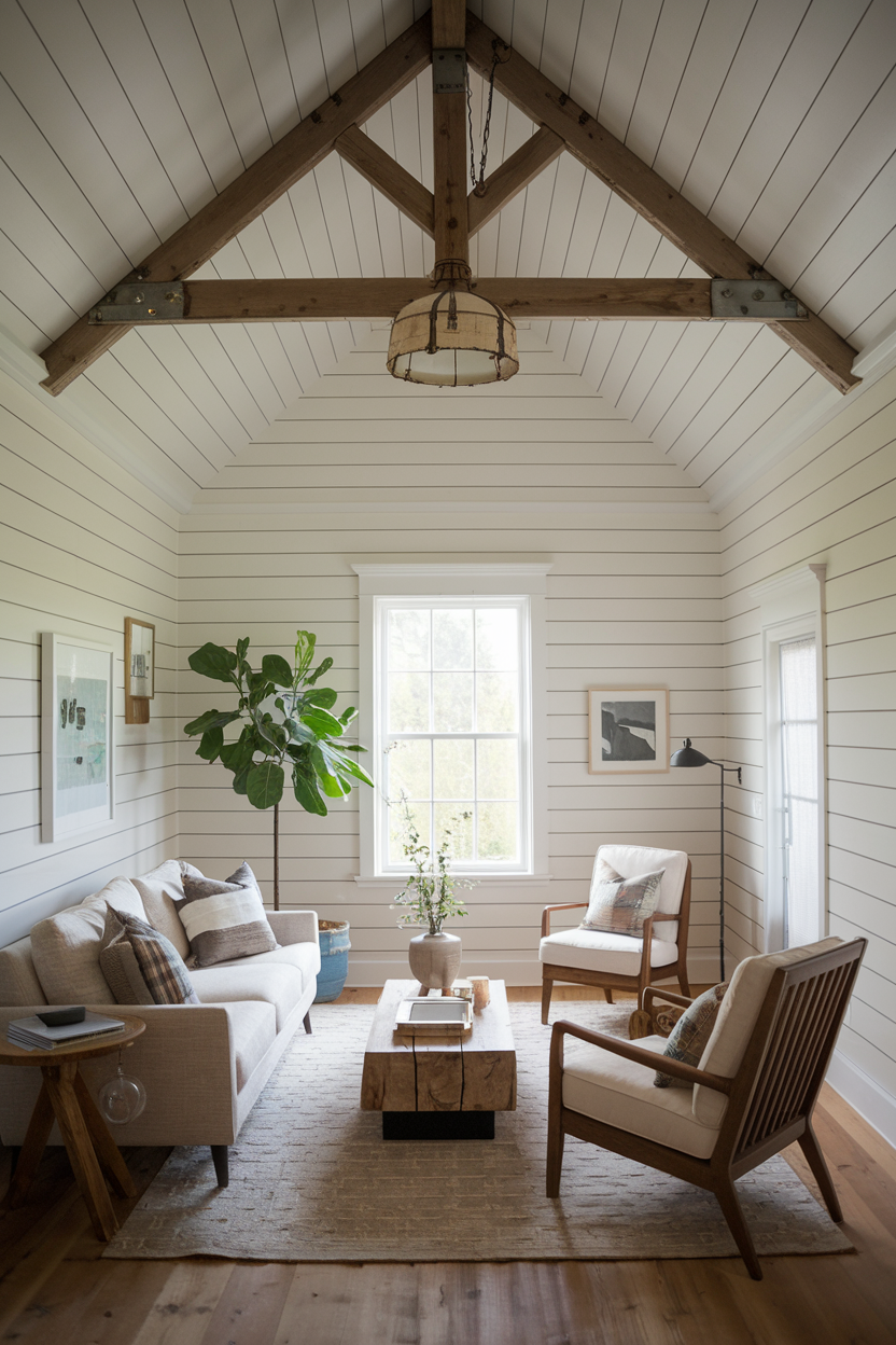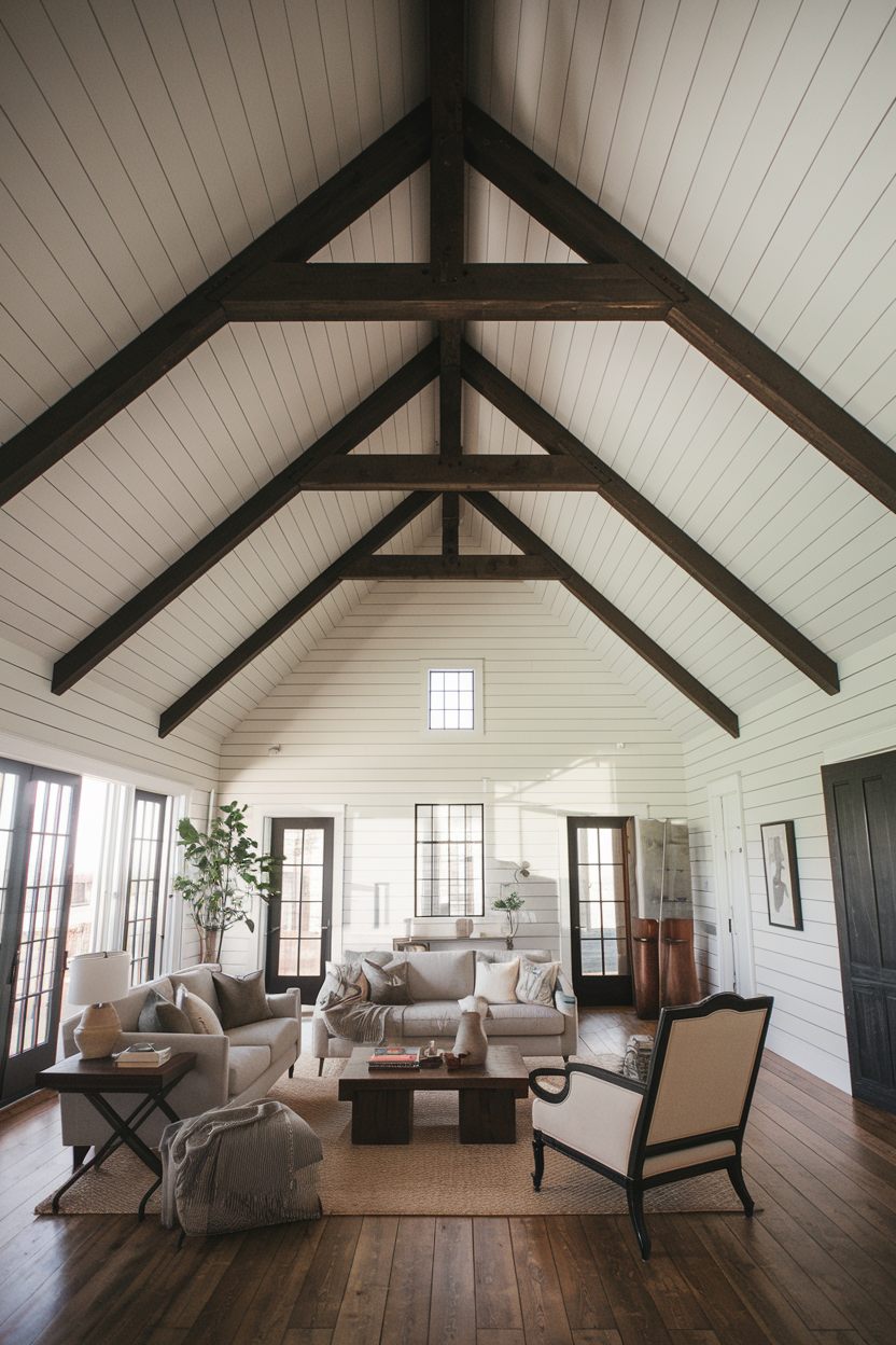 Vaulted ceilings are a striking architectural feature on their own, but adding white shiplap and dark-stained wood beams takes them to the next level. The beams draw the eye upward, enhancing the room’s vertical space, while the white backdrop keeps the overall look light and open. The contrast of dark wood against the crisp planks adds drama and elegance, perfect for great rooms, master bedrooms, or any space that needs a bold design statement without feeling too heavy.