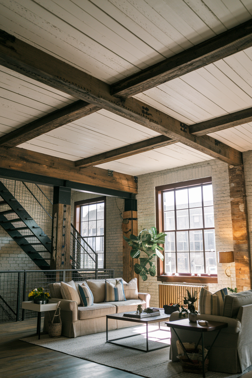 Modern lofts often feature open layouts and industrial finishes, but you can add warmth and contrast with a shiplap ceiling and rustic wood beams. The combination helps soften metal or concrete surroundings, making the space feel more welcoming. Opt for warm wood tones and uniform beam spacing for a cleaner, more intentional look. This approach blends city sophistication with countryside soul, creating a well-balanced, eclectic interior.