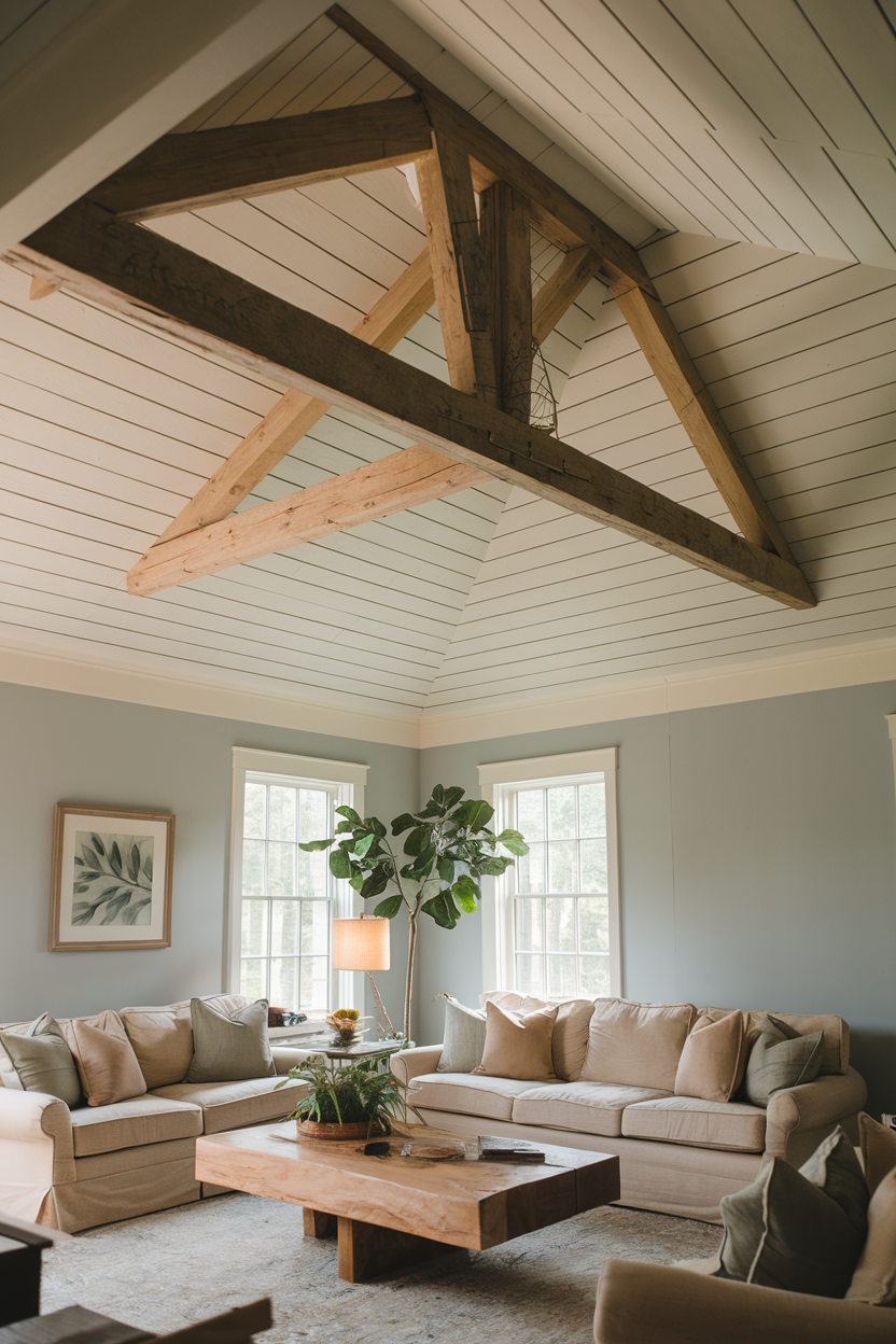 For those who love the warmth of rustic design but also crave the simplicity of modern interiors, this ceiling design strikes the perfect balance. White shiplap offers a crisp and minimalist base, while exposed beams in a light natural finish add the touch of wood that softens the overall look. The result is a space that feels contemporary yet comfortable, ideal for open living areas or modern farmhouse builds that want to keep things clean but cozy.