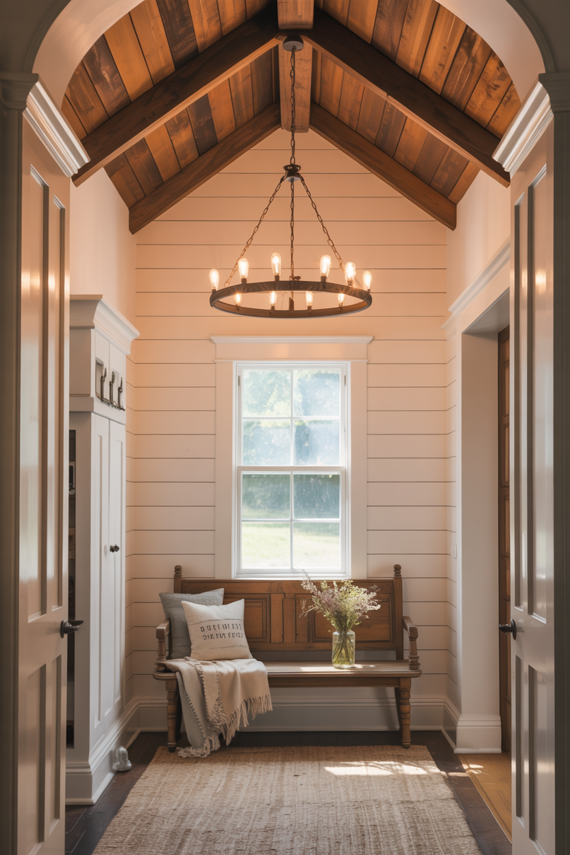 Make a bold first impression with a rustic entryway ceiling that combines white shiplap and warm-toned wood beams. The layered textures add dimension and interest to the transitional space while also echoing the overall design language of your home. Use wider beams to draw the eye inward and create a grand sense of arrival. Soft pendant lighting or a wrought iron fixture can accentuate the wood grain and cast beautiful shadows, giving even the smallest foyers a warm and inviting personality.