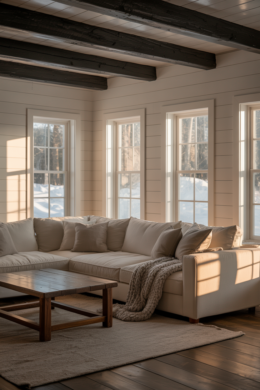 In large open-concept homes, beams can serve a functional purpose by visually separating zones like the kitchen, dining, and living areas. Installing beams on top of a uniform shiplap ceiling helps subtly define these spaces without using walls. This approach creates a seamless flow while maintaining the cozy, rustic atmosphere. You can also vary the beam stain slightly between areas to further enhance the zoning effect, making each section feel distinct yet connected.