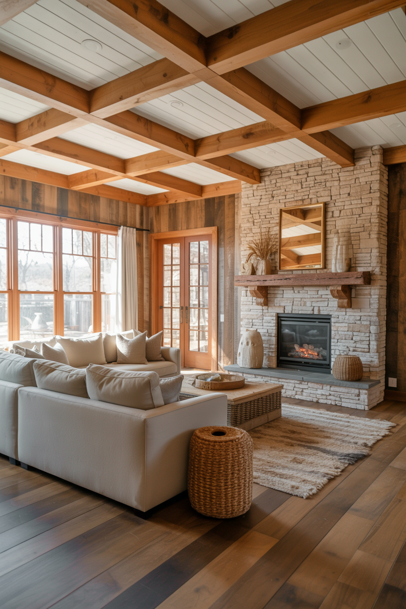 Blending different wood tones in your beams and shiplap planks adds complexity and warmth to the ceiling. For example, pairing honey-hued beams with pale ash or white oak shiplap creates visual variety without straying from the rustic palette. This method avoids a one-dimensional look and enhances the natural, layered feel of the space. It’s perfect for larger rooms where you want to create a ceiling that feels custom and rich in texture.