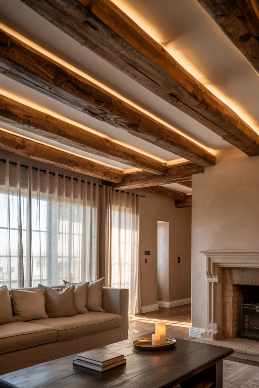 Pairing rustic beams with concealed strip lighting adds a modern upgrade to your traditional design. Tuck LED lights behind or alongside the beams to create a subtle glow that highlights the wood’s texture and illuminates the space softly. This design element is perfect for bedrooms, media rooms, or any space where ambient lighting enhances the mood. It blends rustic charm with functional elegance and gives your ceiling a contemporary twist.