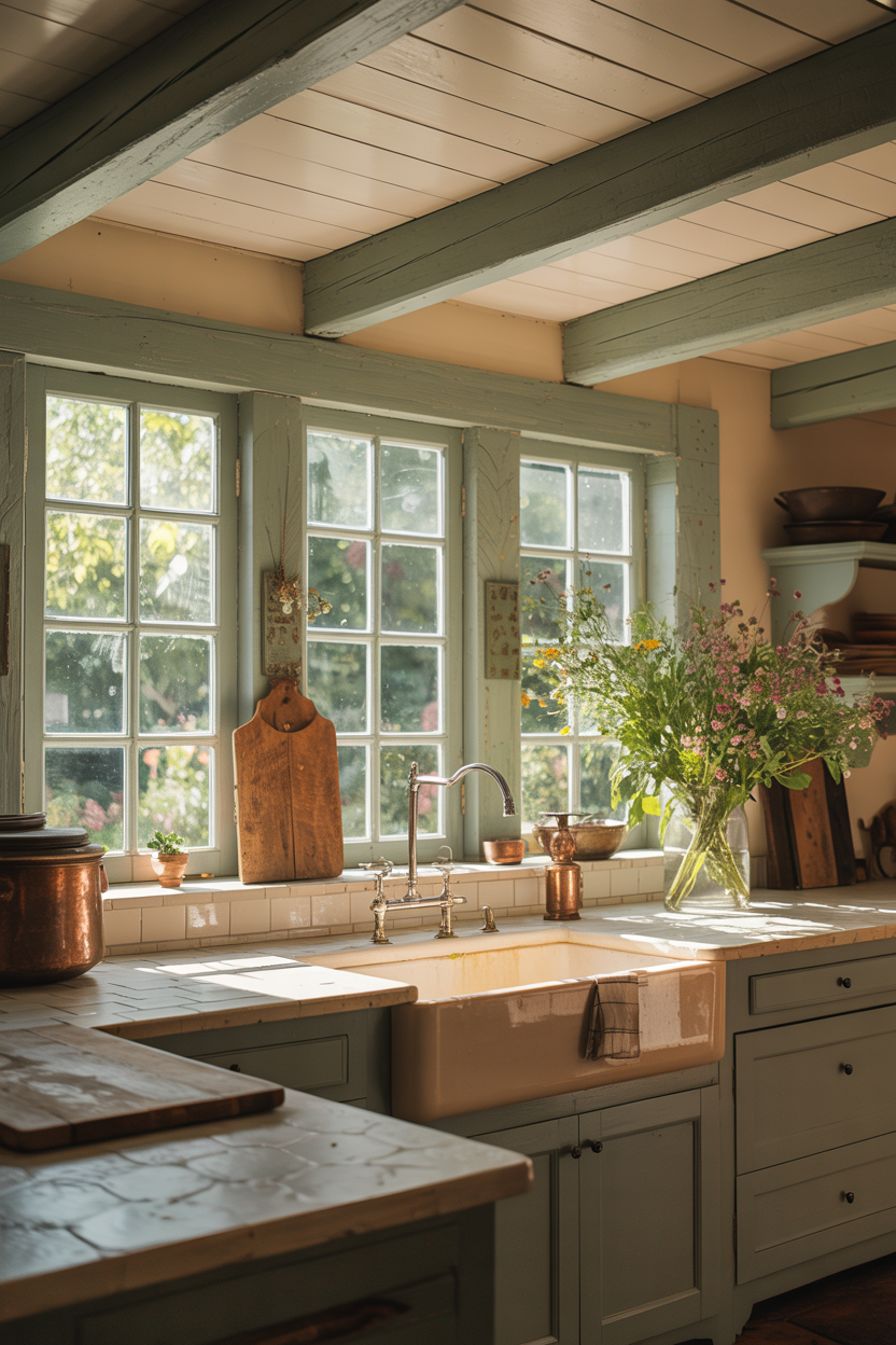 In a cozy cottage kitchen, a shiplap ceiling with soft gray or cream-painted beams can add vintage appeal and gentle warmth. Unlike the bolder contrasts in modern rustic designs, this look leans into subtlety and softness. The muted palette allows light to bounce around while the beams add just enough detail to make the ceiling feel grounded and charming. Pair with shaker cabinets and open shelving for a full cottage-core aesthetic.