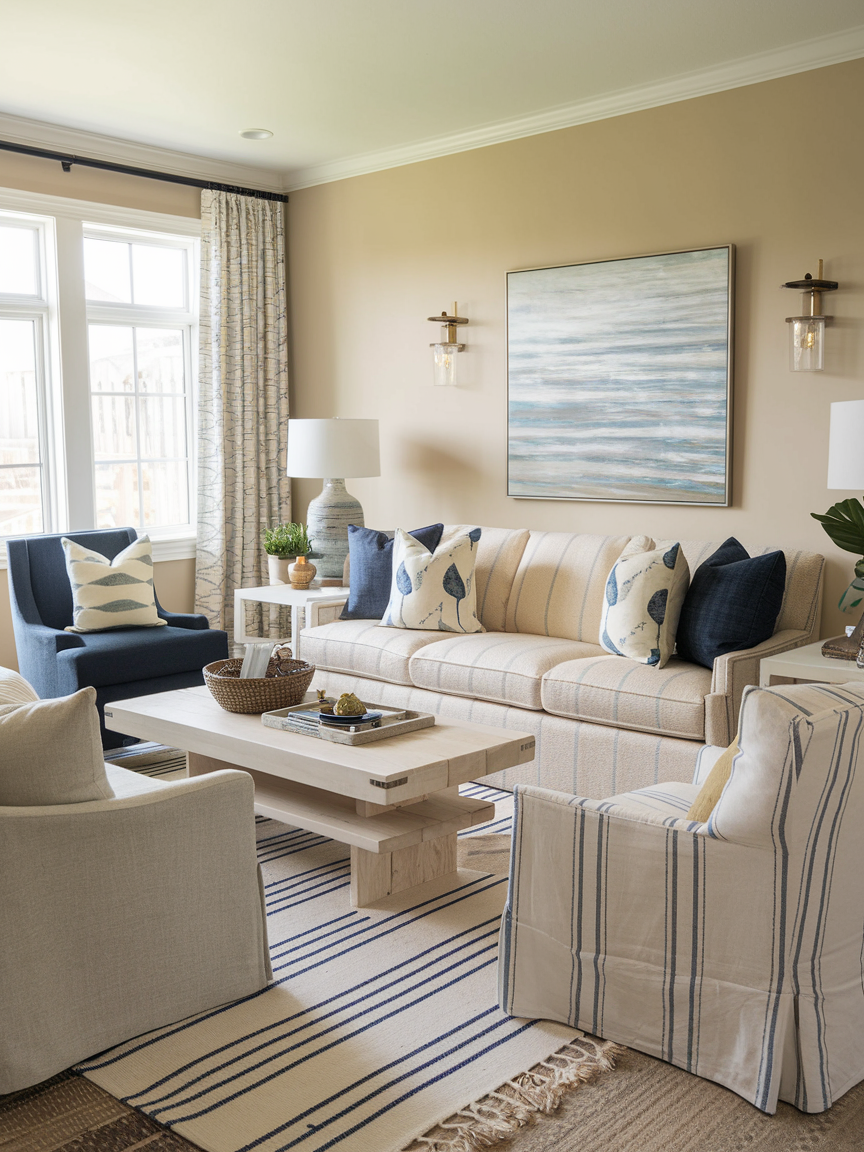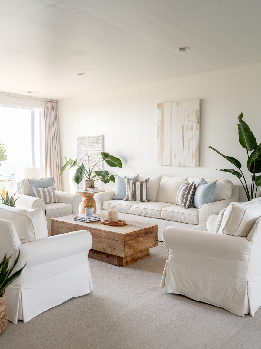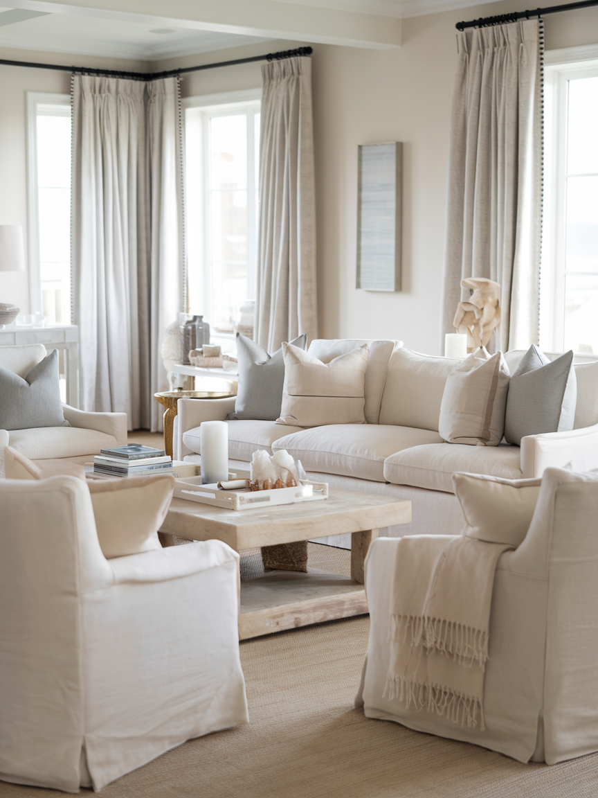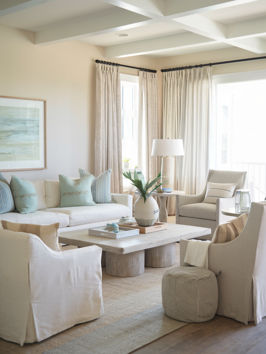 Slipcovered sofas and chairs offer both style and practicality, making them ideal for a laid-back coastal space. Their slightly loose fit adds to the casual, effortless look while providing easy maintenance. Neutral fabrics keep the design cohesive, while the soft silhouettes make the room feel comfortable and welcoming. This type of furniture perfectly balances functionality with aesthetic appeal.