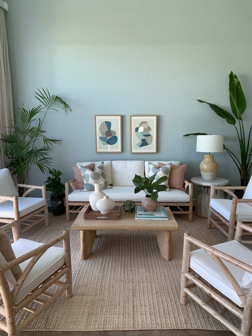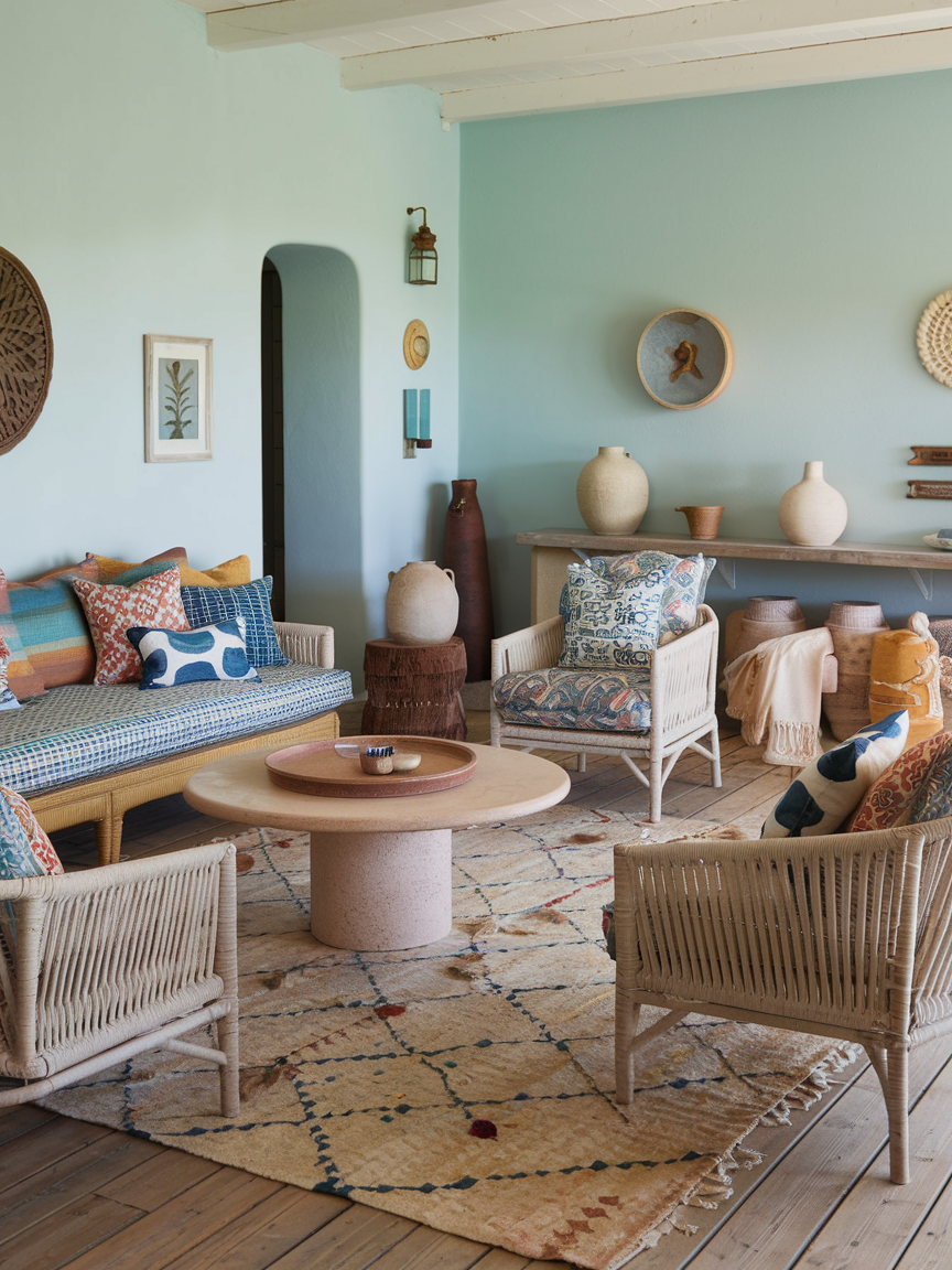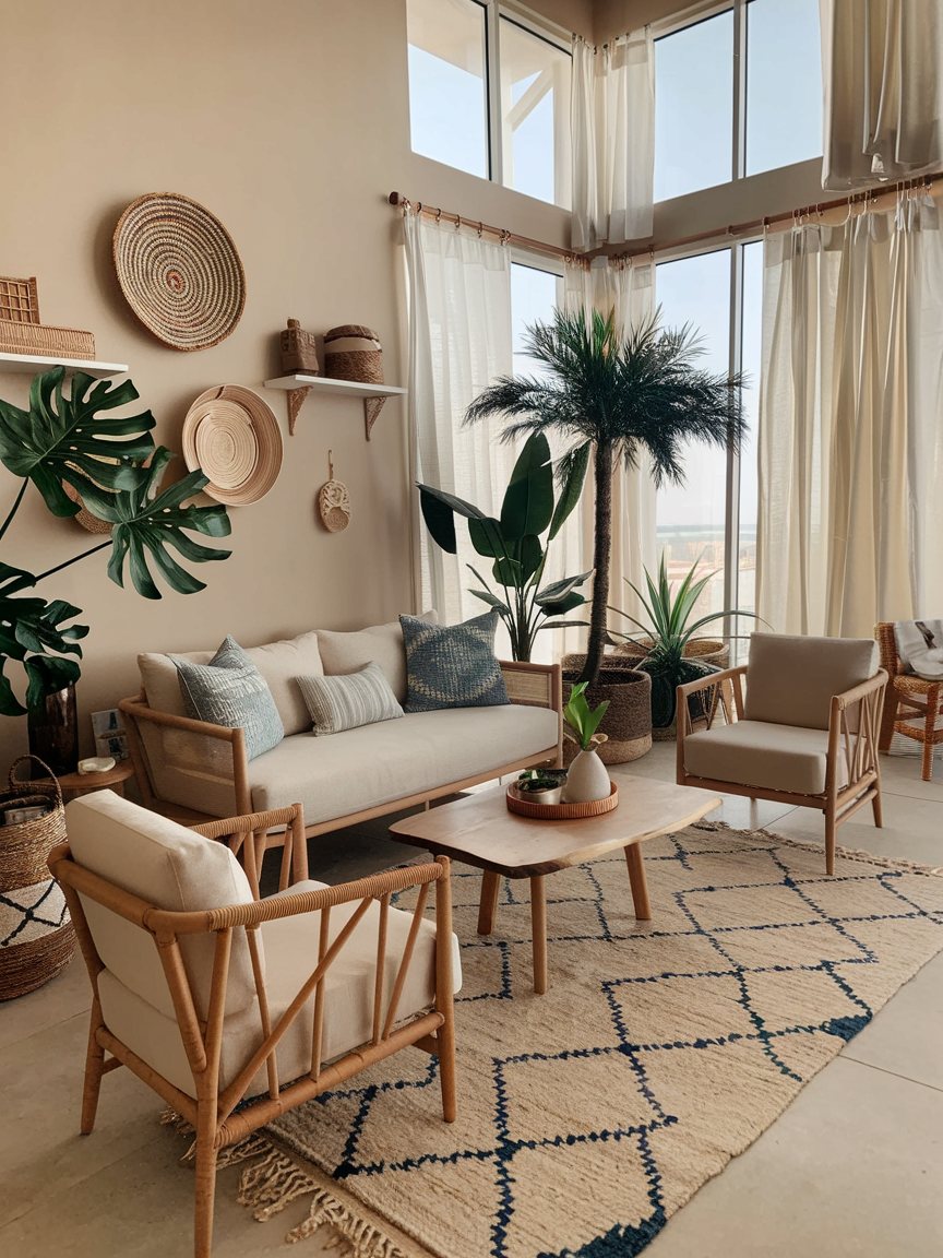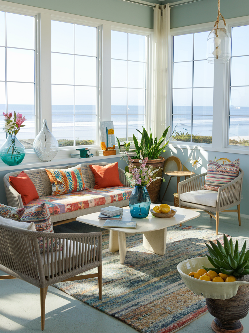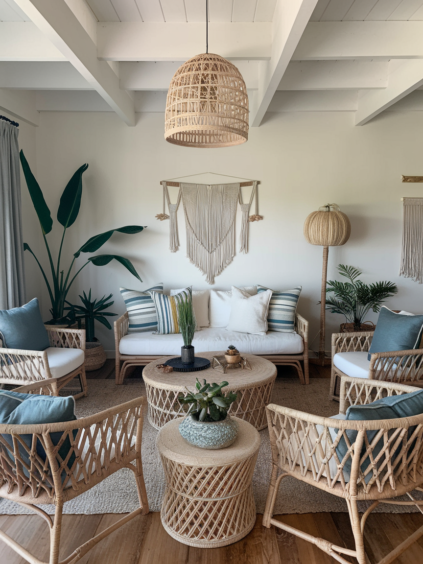 A well-designed boho coastal space blends organic materials with layered decor to achieve a balanced and visually interesting look. Woven accents, wooden furniture, linen fabrics, and subtle patterns add warmth and depth while maintaining a breezy atmosphere. Thoughtful styling choices and natural light enhance the overall feel, allowing the room to remain open, fresh, and easygoing.