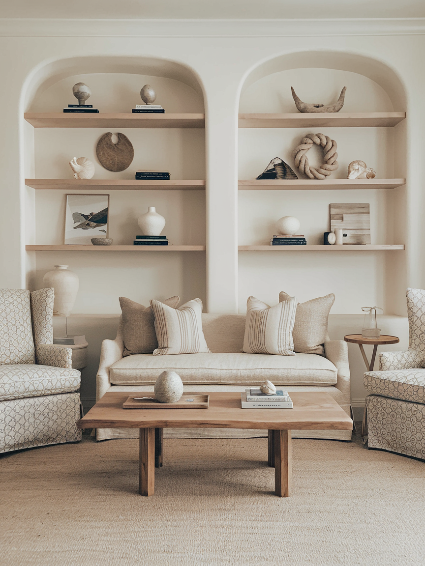 Open shelving allows you to showcase personality while maintaining a light and uncluttered feel. Instead of overcrowding the shelves, carefully curate a selection of items such as ceramics, books, small plants, and coastal-inspired objects. Leaving negative space between pieces is key to keeping the display balanced and visually calming. This approach creates a layered yet airy look, where every item feels intentional and contributes to the overall harmony of the room.
