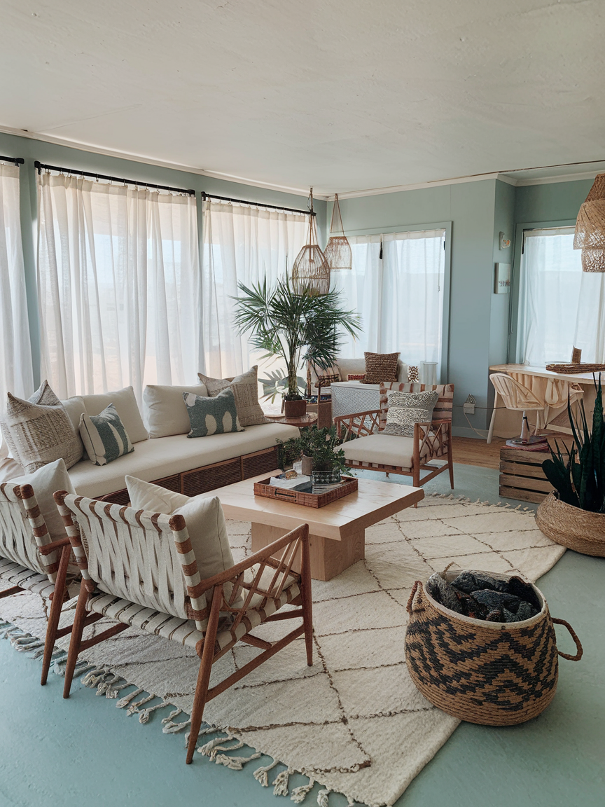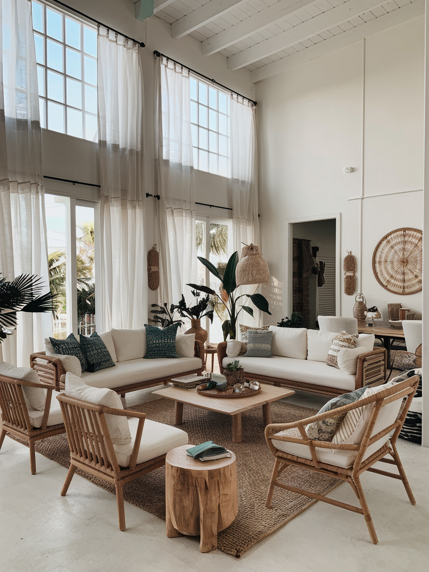 Boho coastal living rooms bring together the laid-back charm of seaside living with the artistic, free-spirited essence of bohemian style. Soft neutral tones, natural textures, and airy layouts create a space that feels light, relaxed, and effortlessly inviting. The combination of these elements results in a living room that captures both comfort and casual elegance, making it perfect for everyday living.