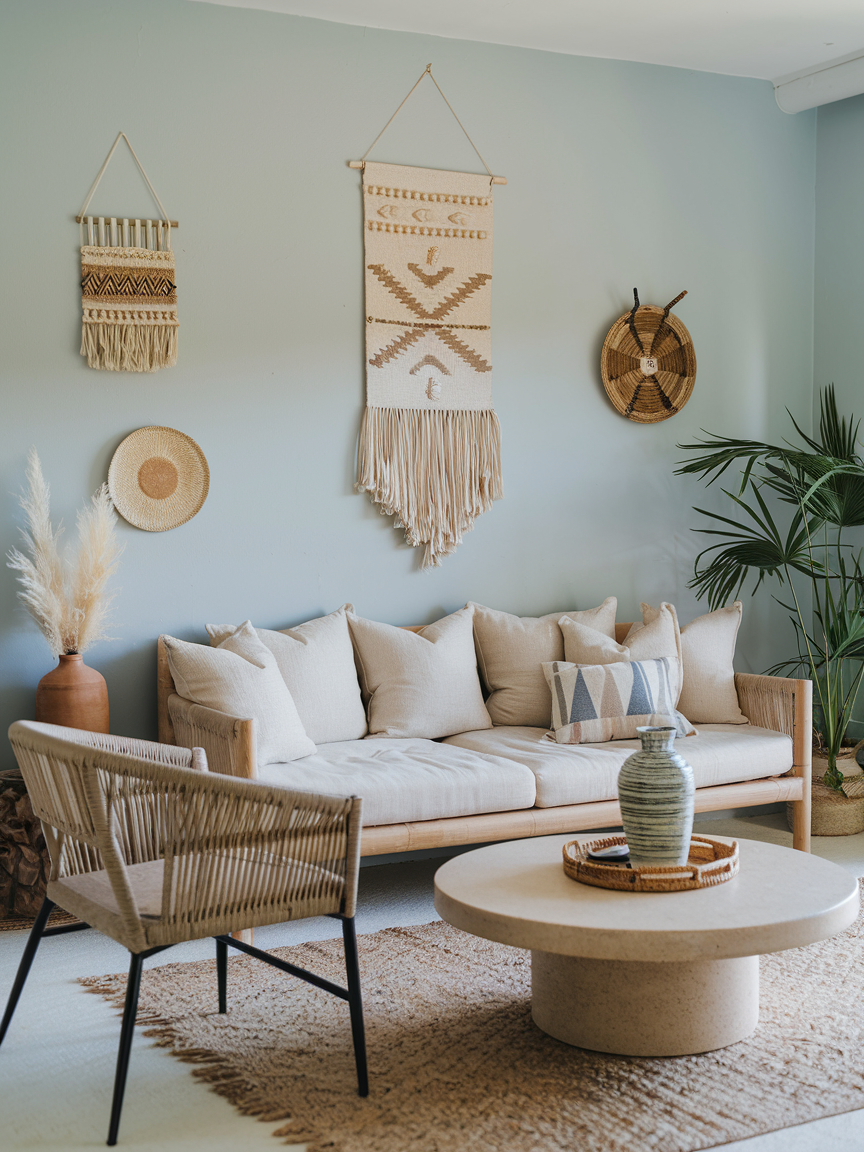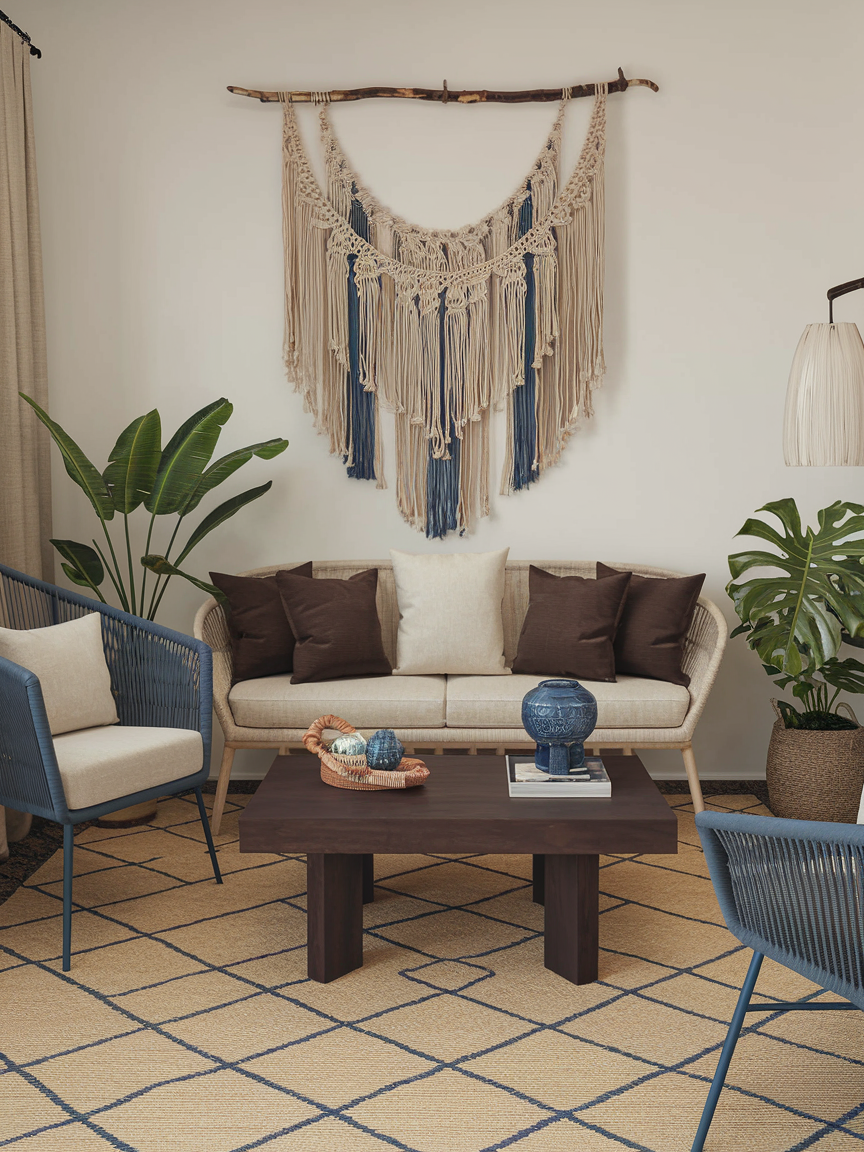 Macramé wall art is a signature element of boho design that adds both texture and visual interest. Its intricate knots and soft fibers create a handcrafted feel that instantly warms up blank walls. Opt for neutral tones to keep the look cohesive and calming. A large macramé piece can act as a focal point without overpowering the room, helping maintain that balanced, serene atmosphere that defines a boho coastal space.