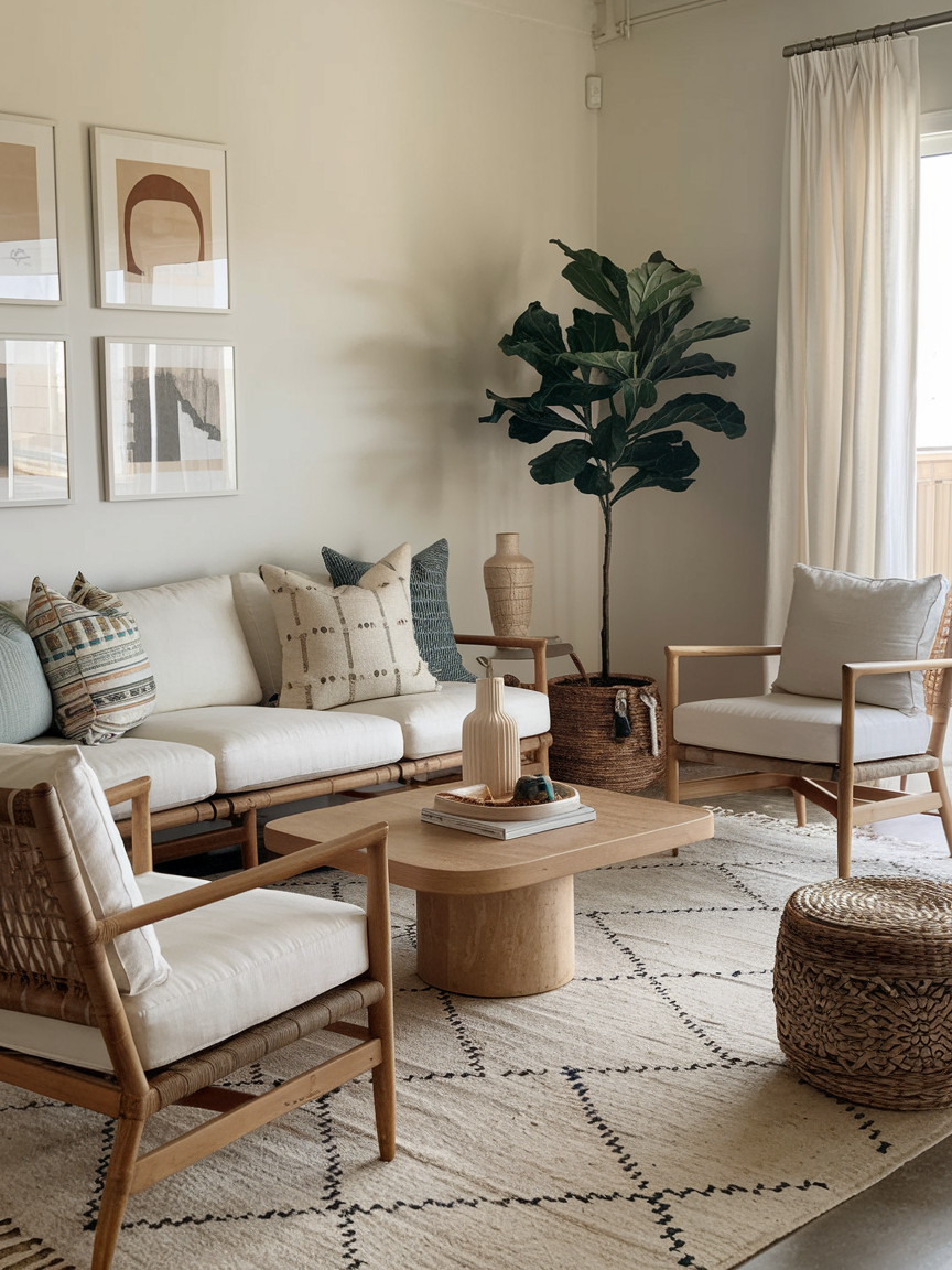 Adding greenery brings life and vibrancy into your living room while enhancing its organic feel. Plants like palms, monstera, or even simple potted herbs introduce natural shapes and fresh color. They contrast beautifully with neutral tones and woven textures, making the space feel more dynamic yet still relaxing. Beyond aesthetics, plants also create a calming environment, helping your living room feel like a refreshing escape.