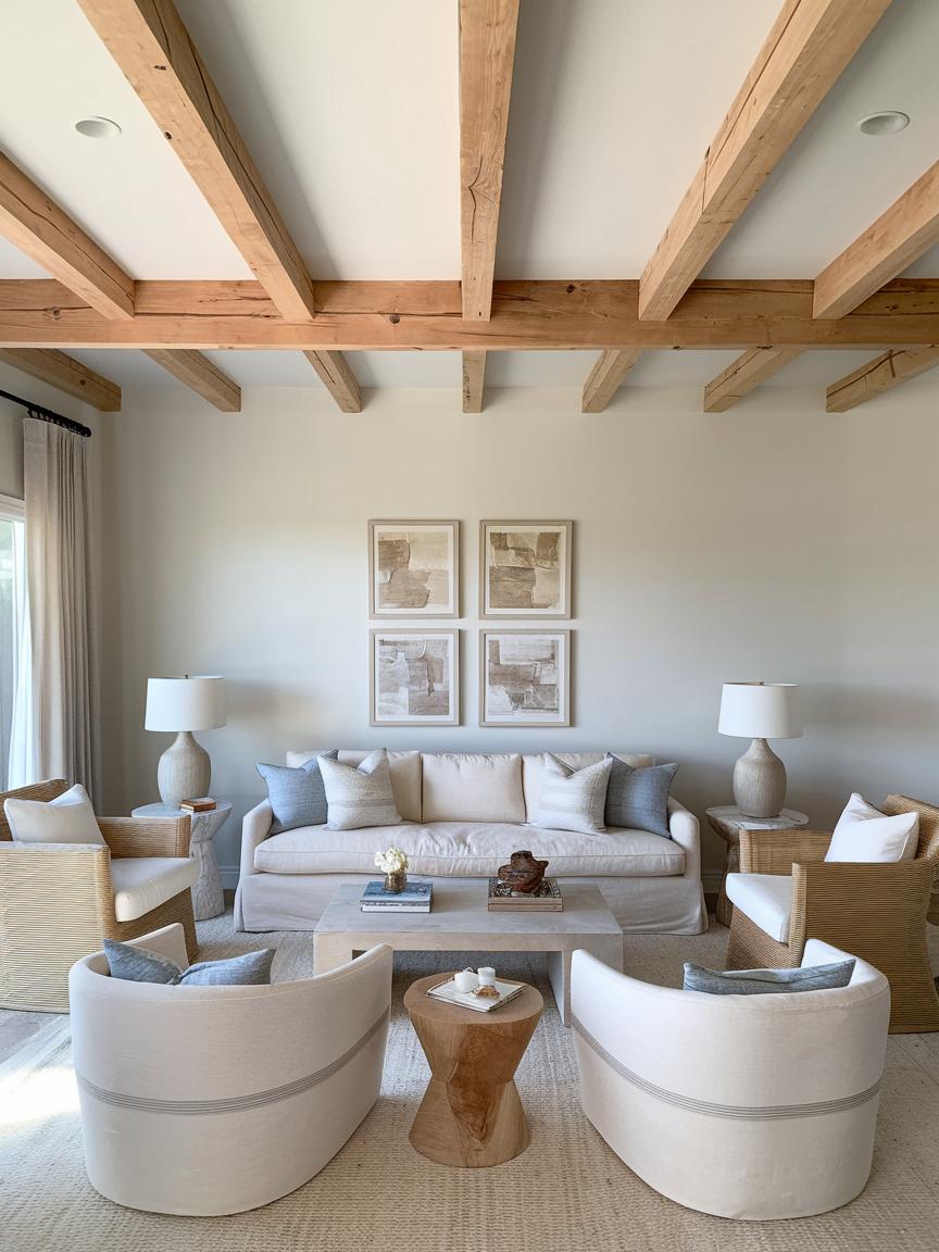 Exposed wooden beams bring warmth, texture, and architectural interest to a boho coastal living room. Their natural finish contrasts beautifully with light walls and soft furnishings, adding depth without heaviness. Whether left raw or lightly whitewashed, beams create a sense of structure while maintaining a relaxed, organic feel. They draw the eye upward, making the room feel more expansive and thoughtfully designed.