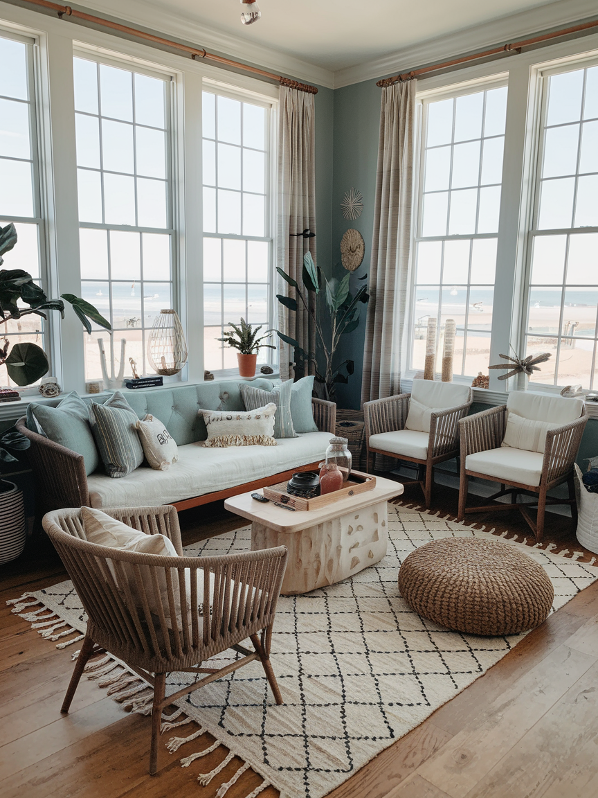 Low-profile seating is a defining feature of boho coastal interiors, instantly creating a grounded and inviting atmosphere. Sofas that sit closer to the floor, paired with poufs, floor cushions, or soft ottomans, encourage a more relaxed way of living. This setup feels casual and approachable, making it perfect for lounging, reading, or hosting friends in a comfortable environment. Keeping the seating visually light also helps maintain openness, allowing the room to feel spacious and breathable rather than crowded or overly structured.