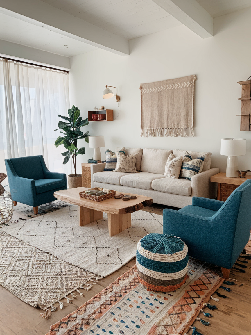 Layering rugs is a simple yet impactful way to add warmth and visual interest. Start with a large neutral rug as your base, then layer a smaller textured or patterned rug on top. This creates dimension and helps define the seating area without overwhelming the space. I find that this technique makes the room feel more grounded and cozy, especially when working with open layouts, while still maintaining that relaxed and airy boho coastal vibe.