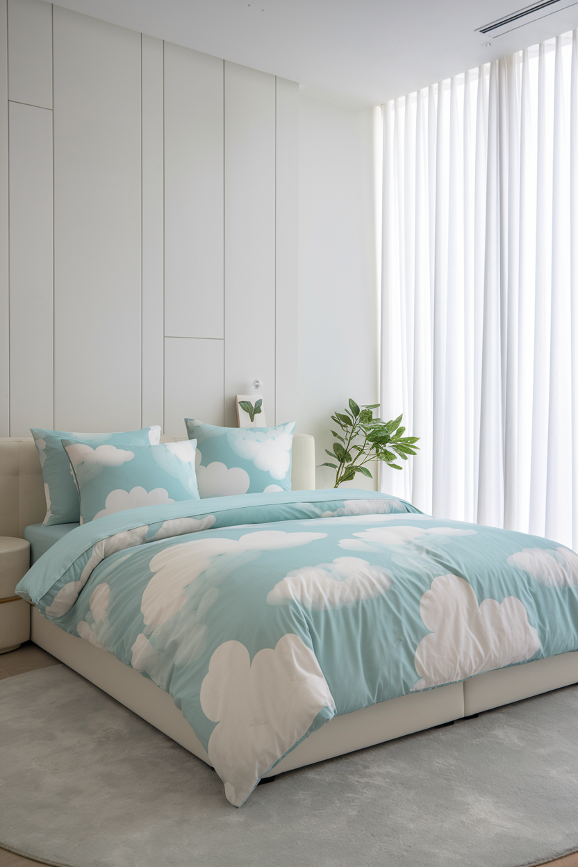 If you’re looking to add a touch of fun to your serene sanctuary without compromising on peace, whimsical patterned bedding is an excellent choice. Opt for gentle, playful patterns like clouds, stars, or abstract florals in muted tones. These designs add interest and personality to the room while maintaining a sense of calm. Pair the bedding with simple, clean furniture and neutral accents to prevent the patterns from overwhelming the space. This style is perfect for those who want a joyful, yet serene atmosphere in their bedroom.