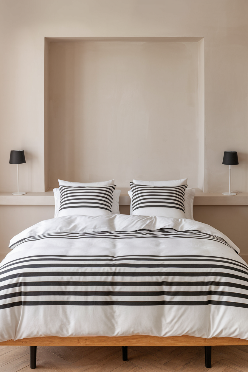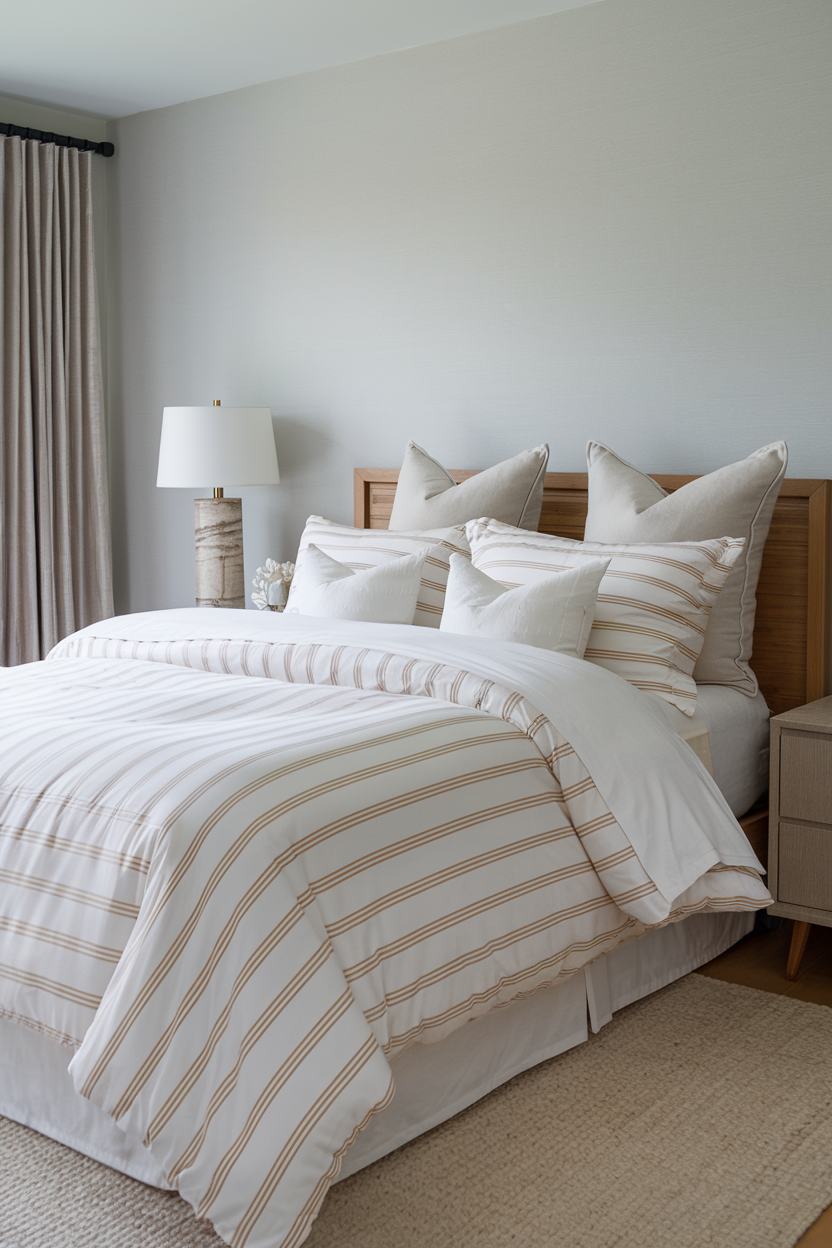 18. Neutral-Toned Bedding with Subtle Stripes for a Classic Look