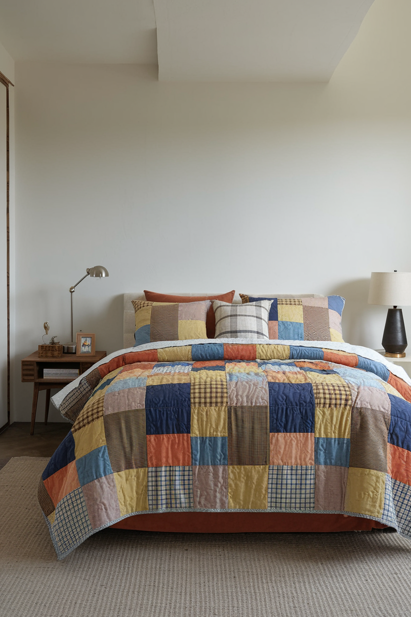 Patchwork quilted bedding brings a sense of nostalgia and charm to your bedroom. The colorful, hand-stitched patterns create a homely and inviting atmosphere that feels both cozy and comforting. Choose a soft palette of pastels or earth tones to create a calming, serene environment, or opt for bolder colors to add vibrancy to your space. The vintage-inspired look of patchwork quilting gives the room character and warmth, making it the perfect addition to a cozy, peaceful bedroom.