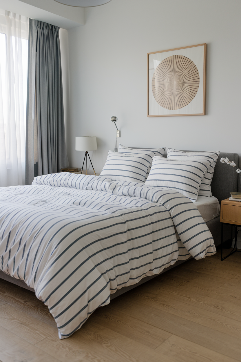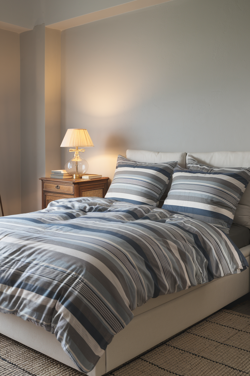 Classic striped bedding adds timeless appeal to your bedroom without sacrificing serenity. Horizontal or vertical stripes in subtle shades of gray, blue, or white can make the space feel relaxed yet sophisticated. Striped bedding works beautifully with other timeless decor elements, such as vintage furniture, soft lighting, and textured rugs, to create a cozy, classic bedroom retreat. This style offers a perfect balance of visual interest and tranquility, ideal for those who want a peaceful yet stylish sanctuary.