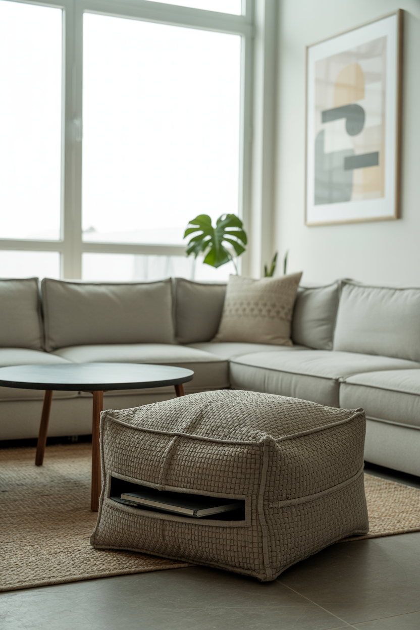 When you’re short on space but need extra storage, a storage pouf is a lifesaver. These poufs feature hidden compartments where you can store blankets, magazines, remote controls, and other items, keeping your living room organized and clutter-free. Available in various materials, including fabric, leather, and woven fibers, storage poufs blend seamlessly into any decor style. Not only do they provide a comfortable resting spot for your feet, but they also help maintain the tidy, minimalist vibe of your space by keeping everyday items out of sight.